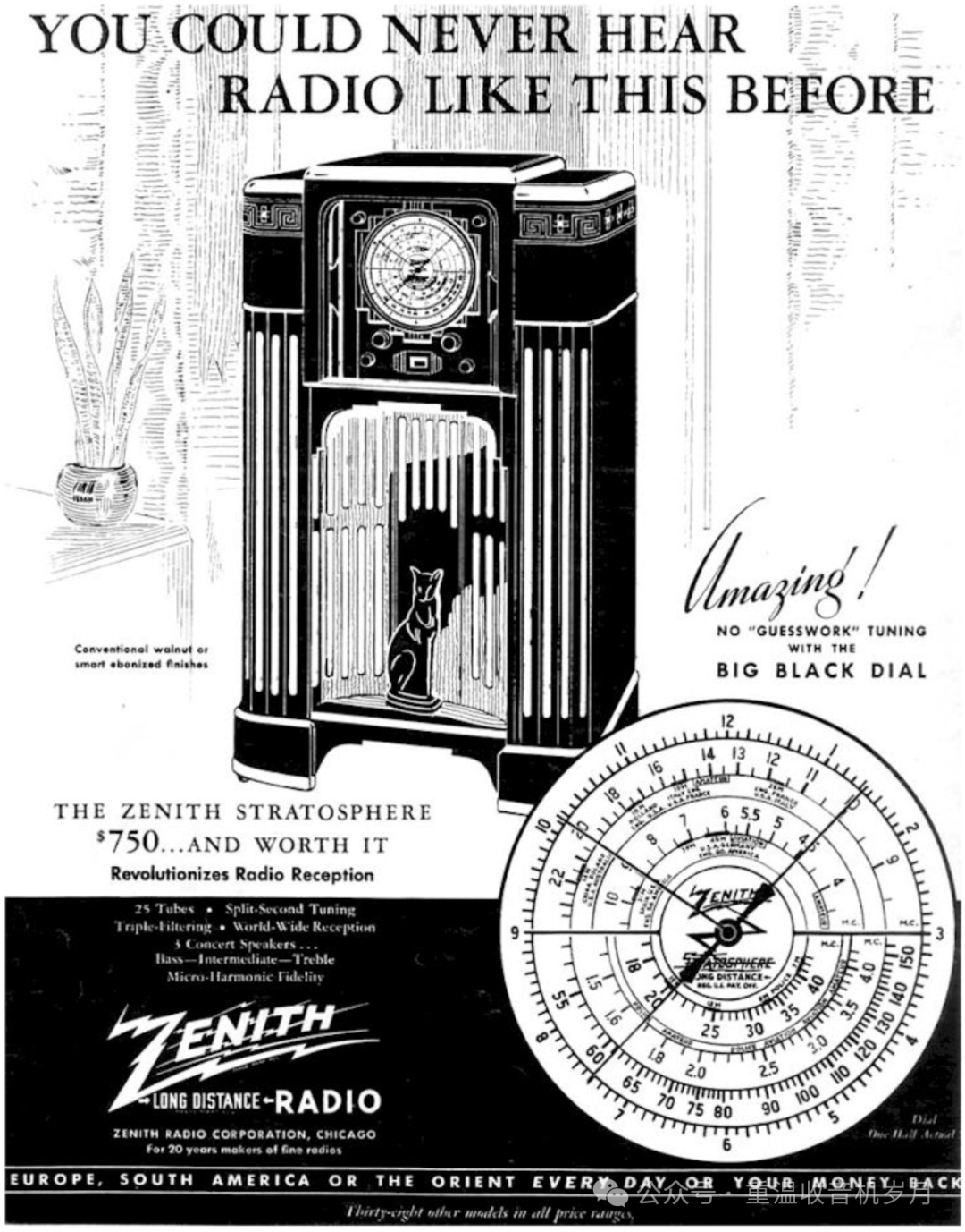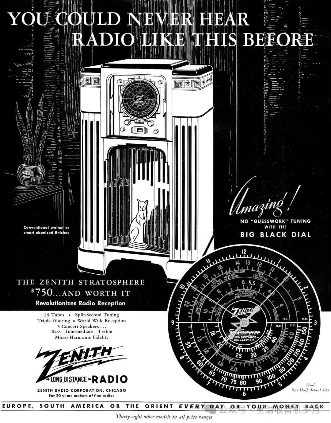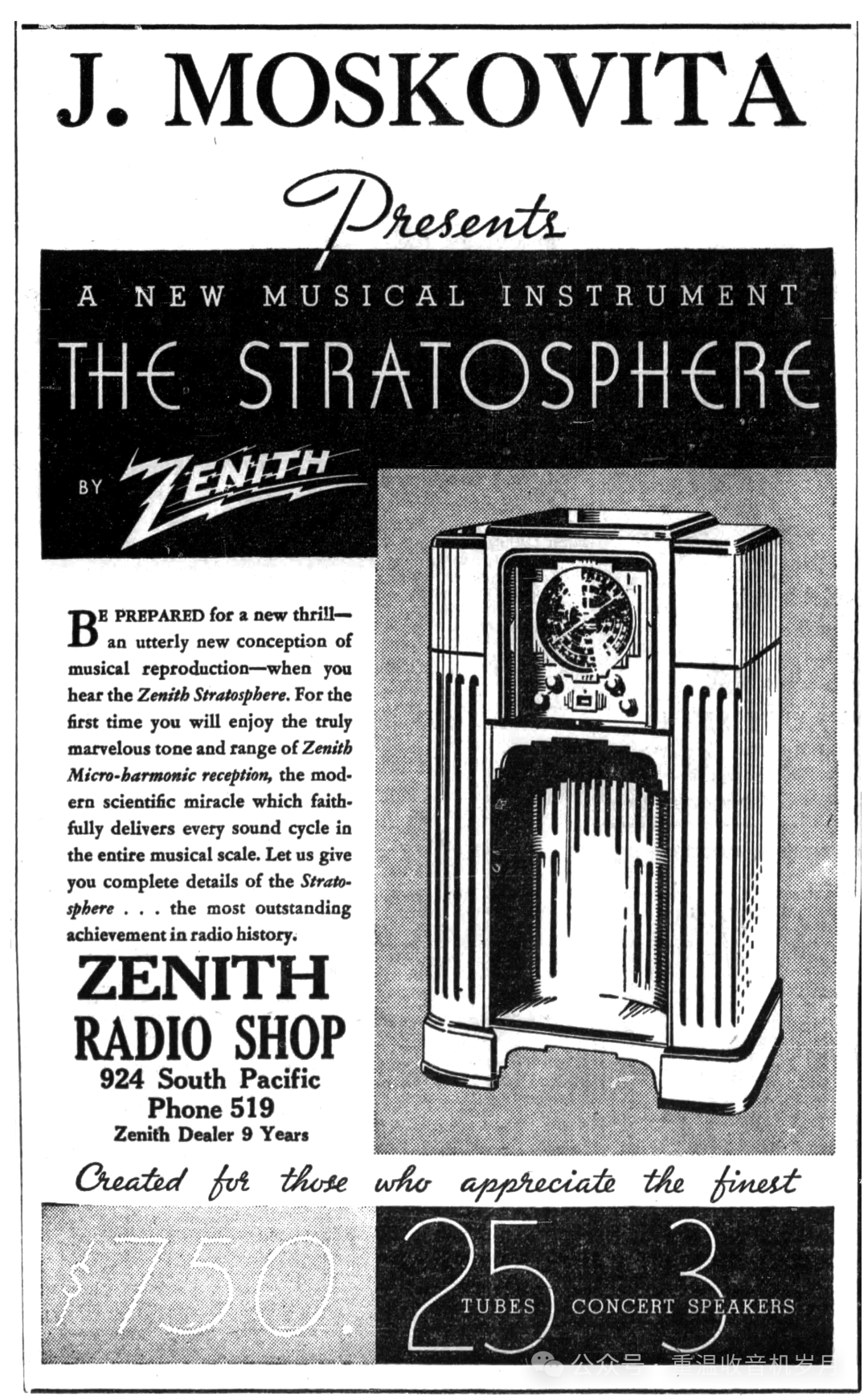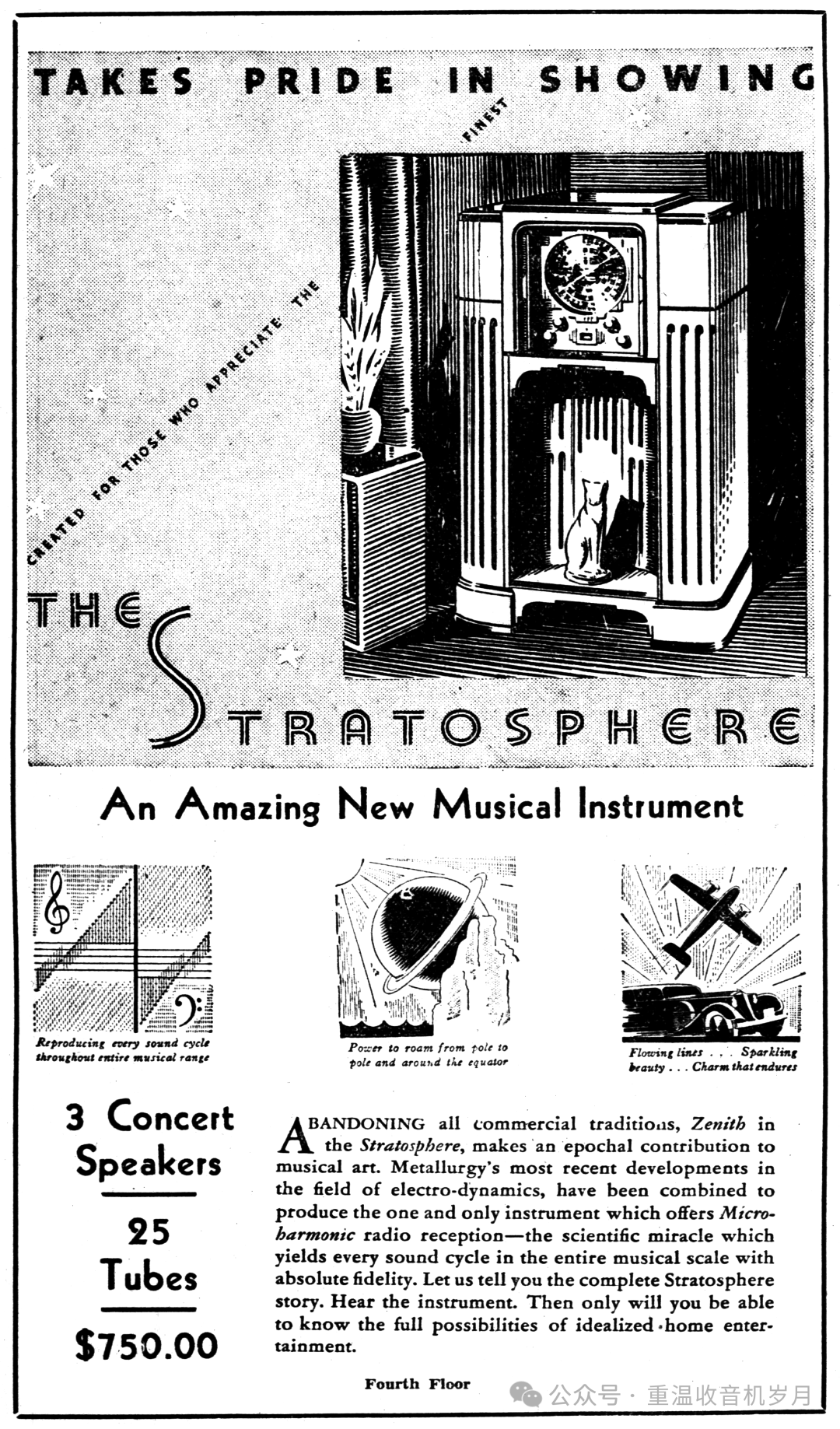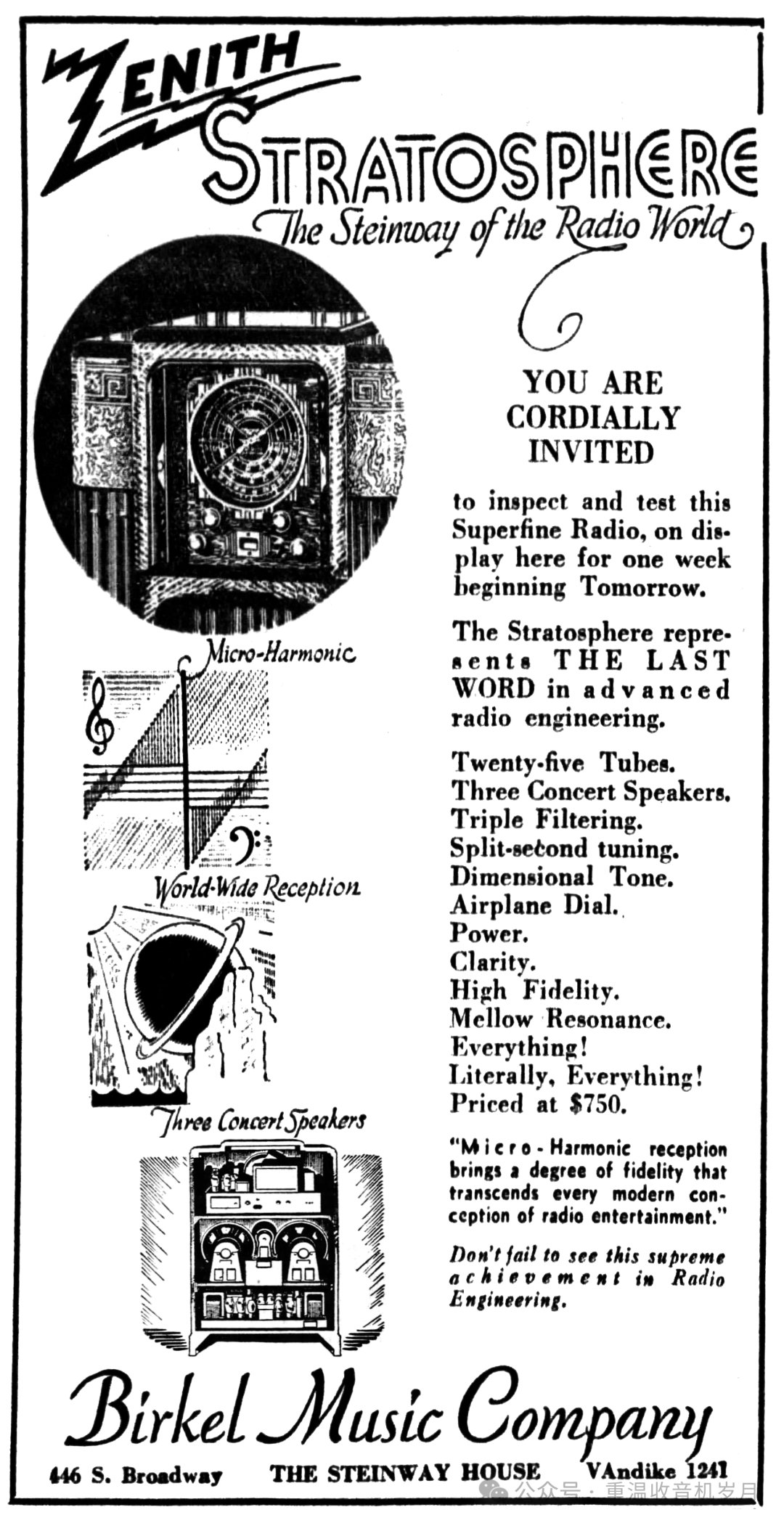 Musson 先生表示:“Stratosphere 无疑是你见过性能最出色的收音机。它配备 25 支真空管、3 个扬声器(两个大型音乐会扬声器 + 1 个高频扬声器),覆盖 5 个波段,调谐范围足以接收全美及所有海外电台。机身设计凝聚了 Zenith 的全部工程精髓,哪怕是普通用户,也能一眼看出它的出众品质。”