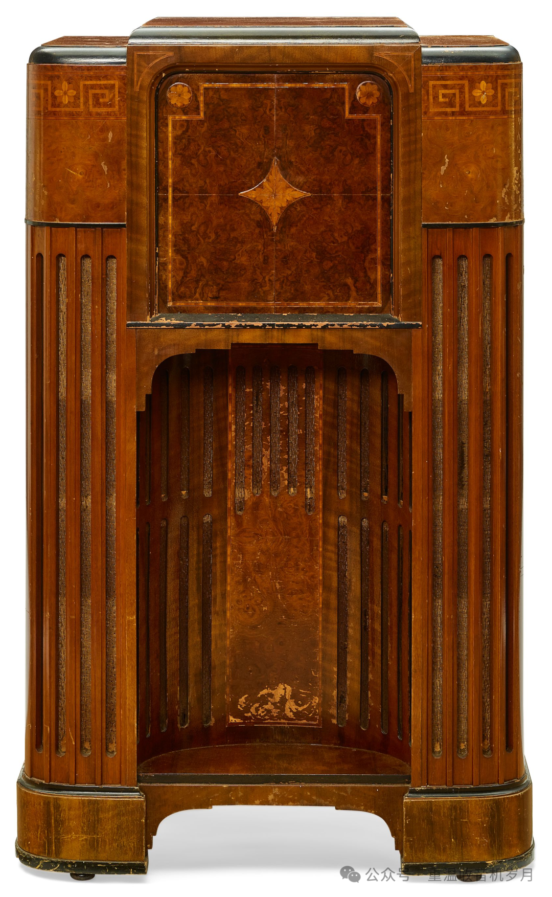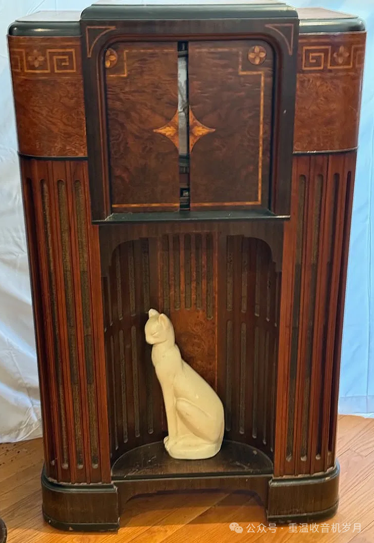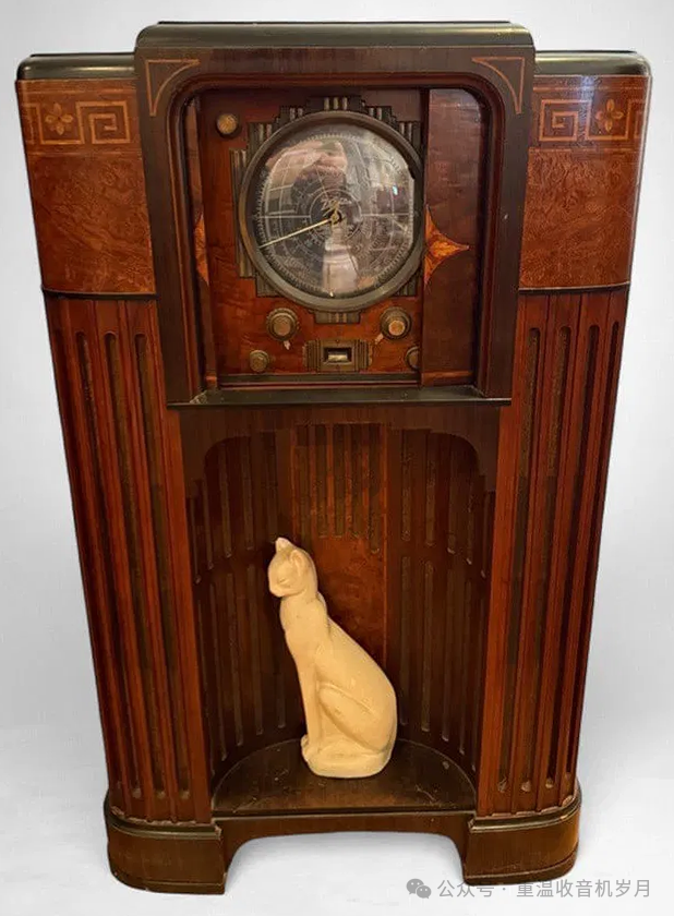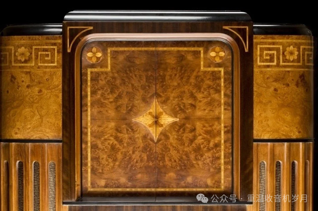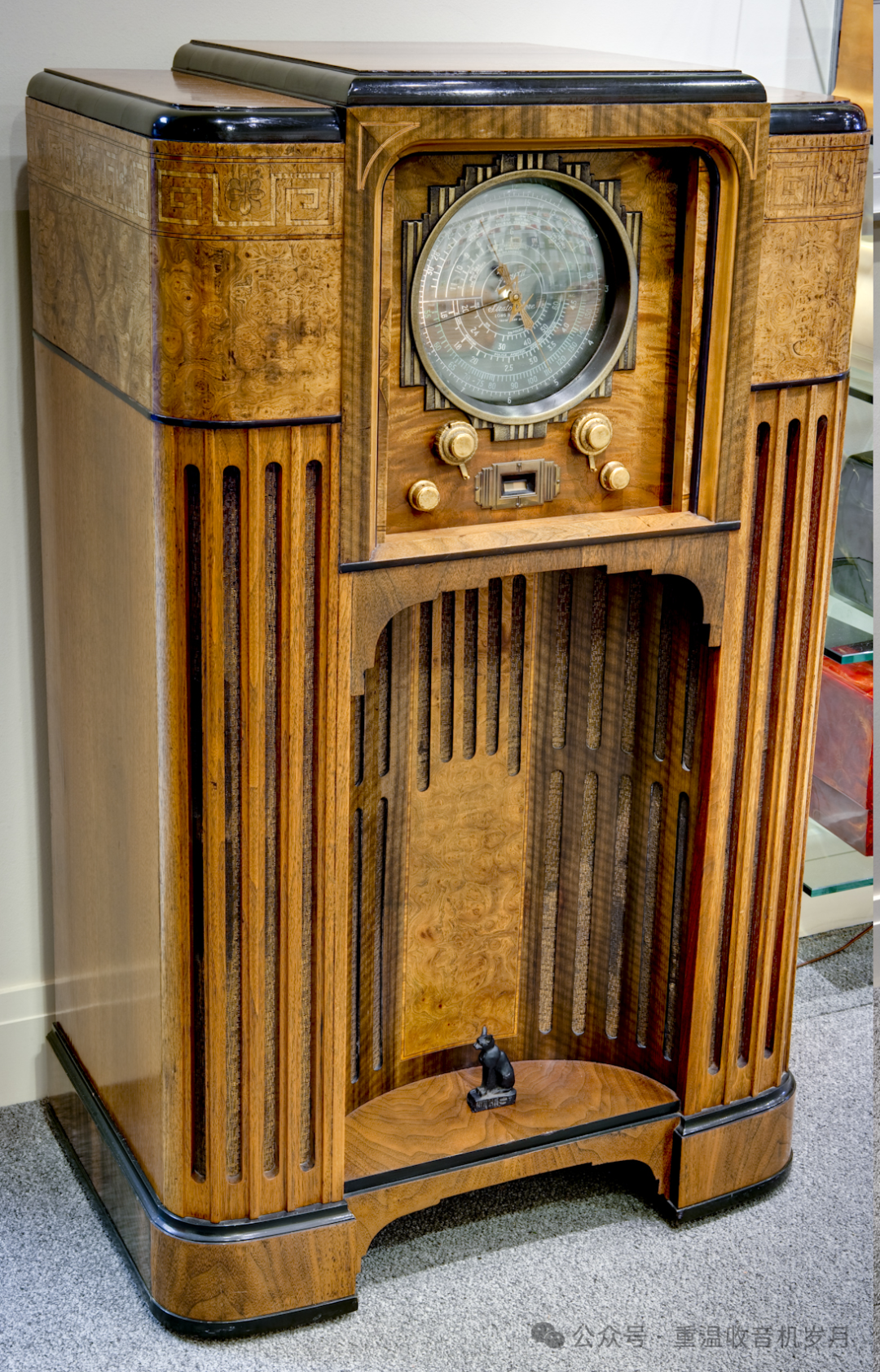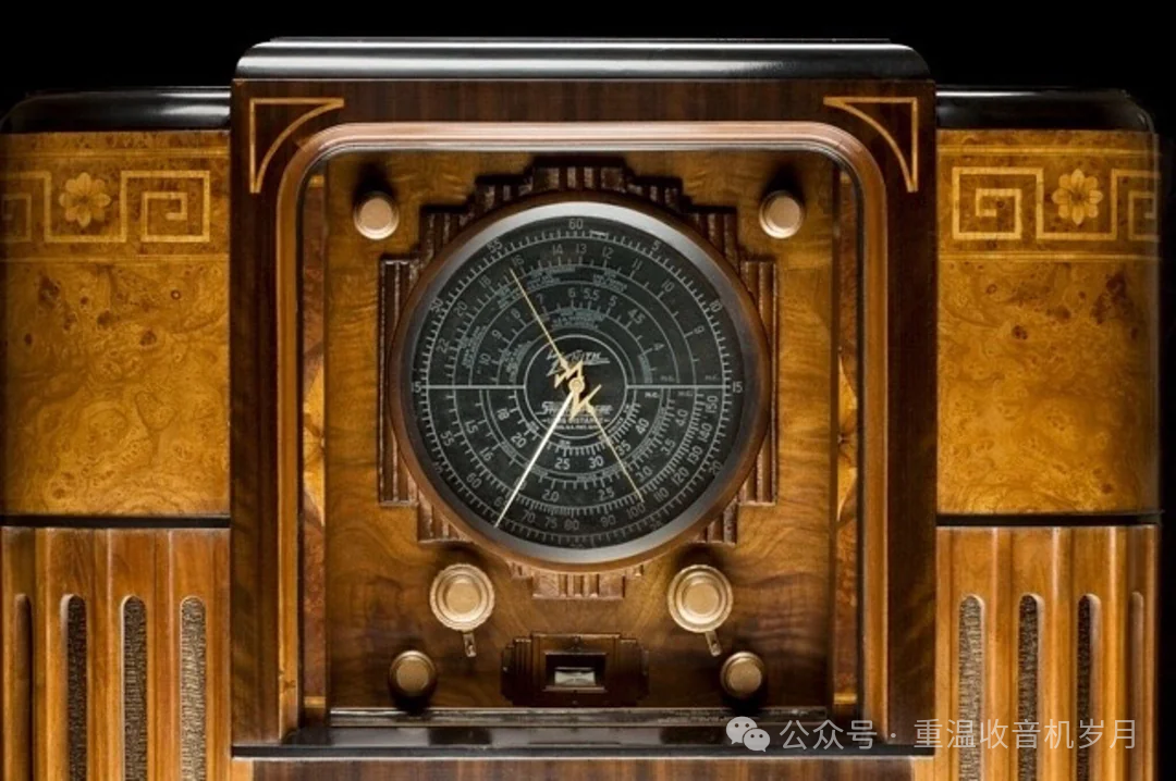 上图所示的Zenith Stratosphere收音机,是近期于纽约市举办的收音机展上最亮眼的机型之一。这是一台配备 25 支真空管的机型,搭载一块由 29 盏灯照明的 10 英寸调谐度盘。机身内置3只扬声器,外壳采用树瘤胡桃木打造,并镶嵌了多种精选木材作为装饰。
