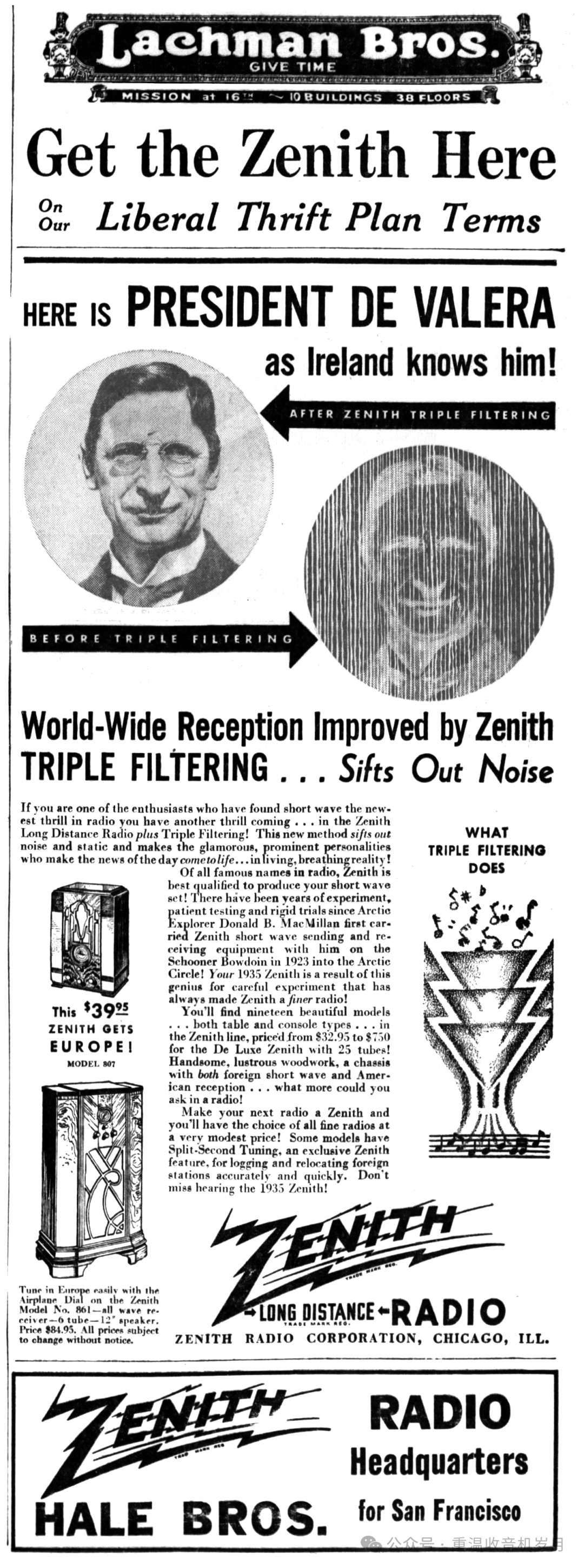 25管Zenith Stratosphere广告,来自《The Los Angeles Times》1935年4月28日第3版。