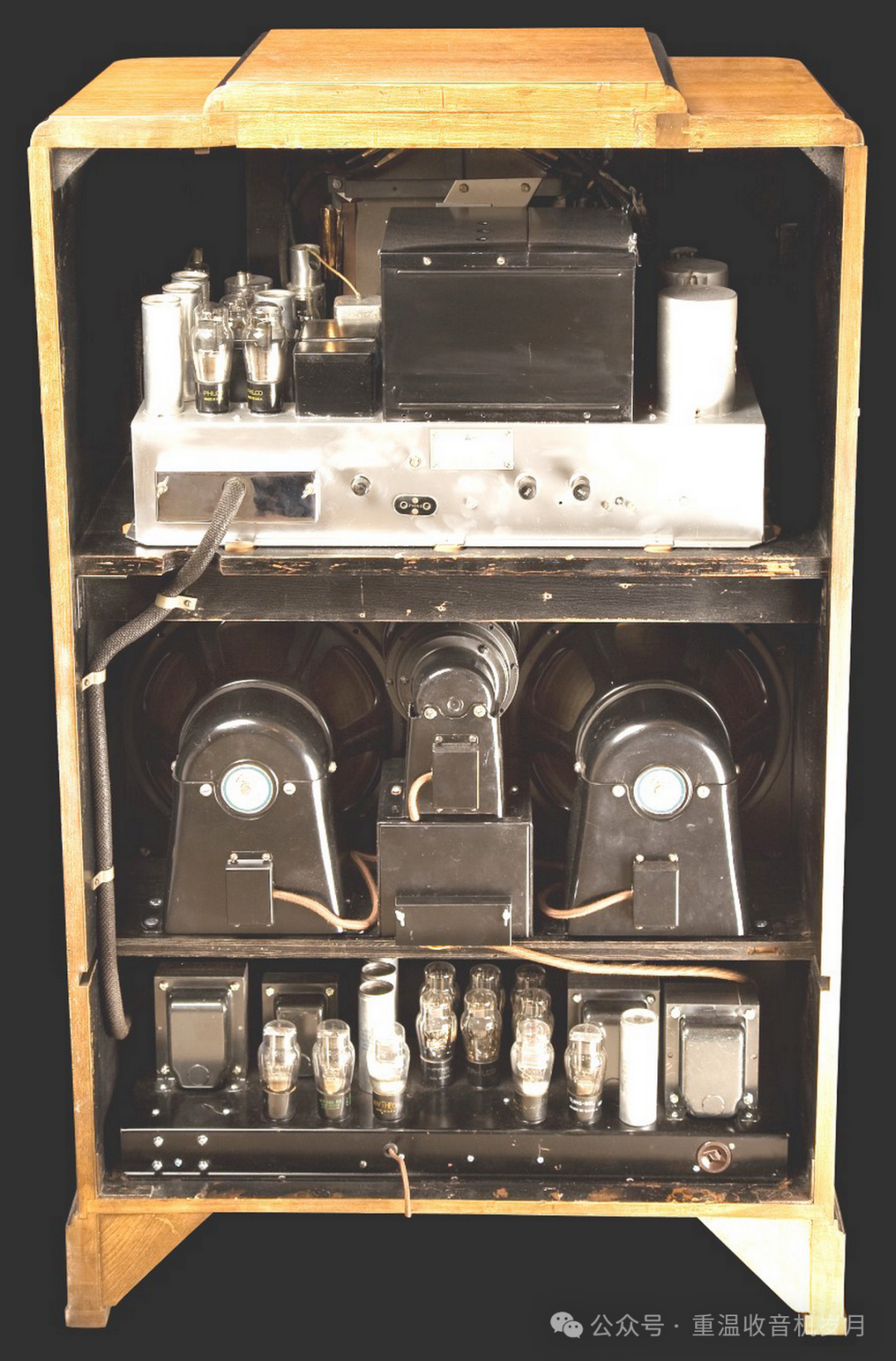 下面来看详细的技术参数:真空管配置包括:6 支 6D6 型管(分别用于第一、第二级射频放大,第一、第二级中频放大,阴影调谐指示器和自动音量控制放大器);1 支 76 型第二检波管;2 支 76 型管组成并联第一音频级;1 支 79 型继电器管(用于 “Q” 值电路);8 支 45 型管组成推挽并联功率输出级;1 支 6A7 型第一检波 / 振荡管;1 支 85 型自动音量控制管;2 支 42 型管组成推挽第二音频级;3 支 5Z3 型整流管。