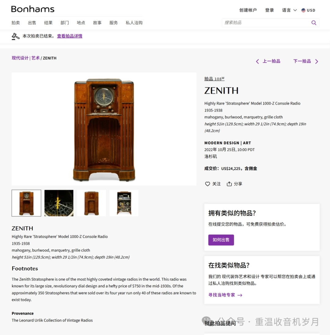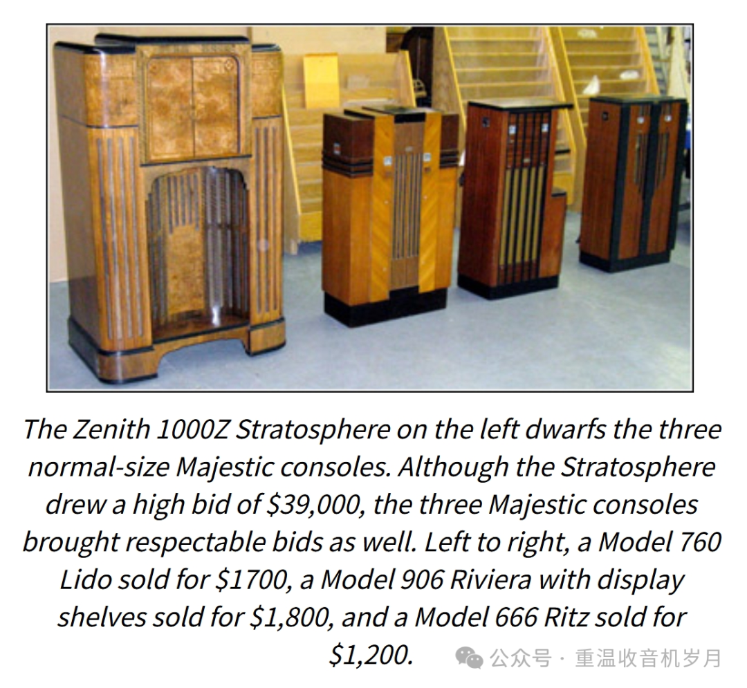 如今,以Stratosphere 1000Z为代表的Zenith高端收音机依旧在延续其传奇,被公认为是古董收音机收藏界最具价值、最受追捧的藏品之一,每一台1000Z的现身都会在拍卖市场上引发轰动,其已知的存世量仅有60台左右。1000Z集奢华的用料、强悍的设计、过剩的性能、精美的工艺和极度的稀缺性于一身,它不仅是一台收音机,更是大萧条时期美国工业设计与制造能力的丰碑。