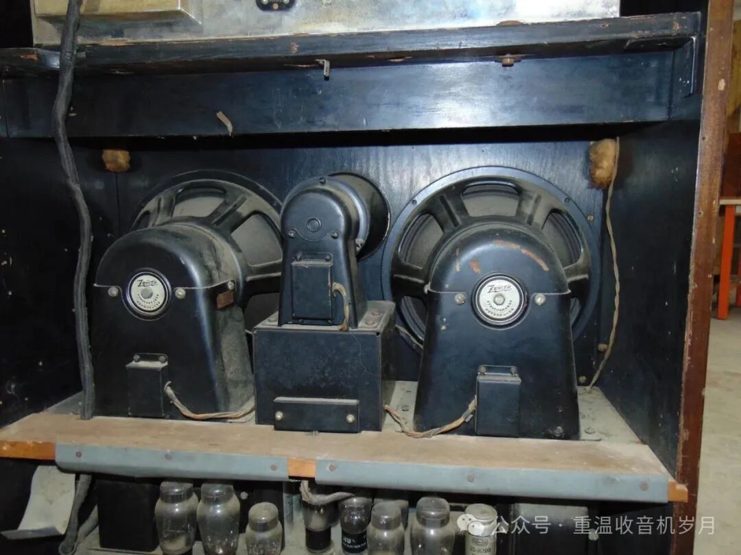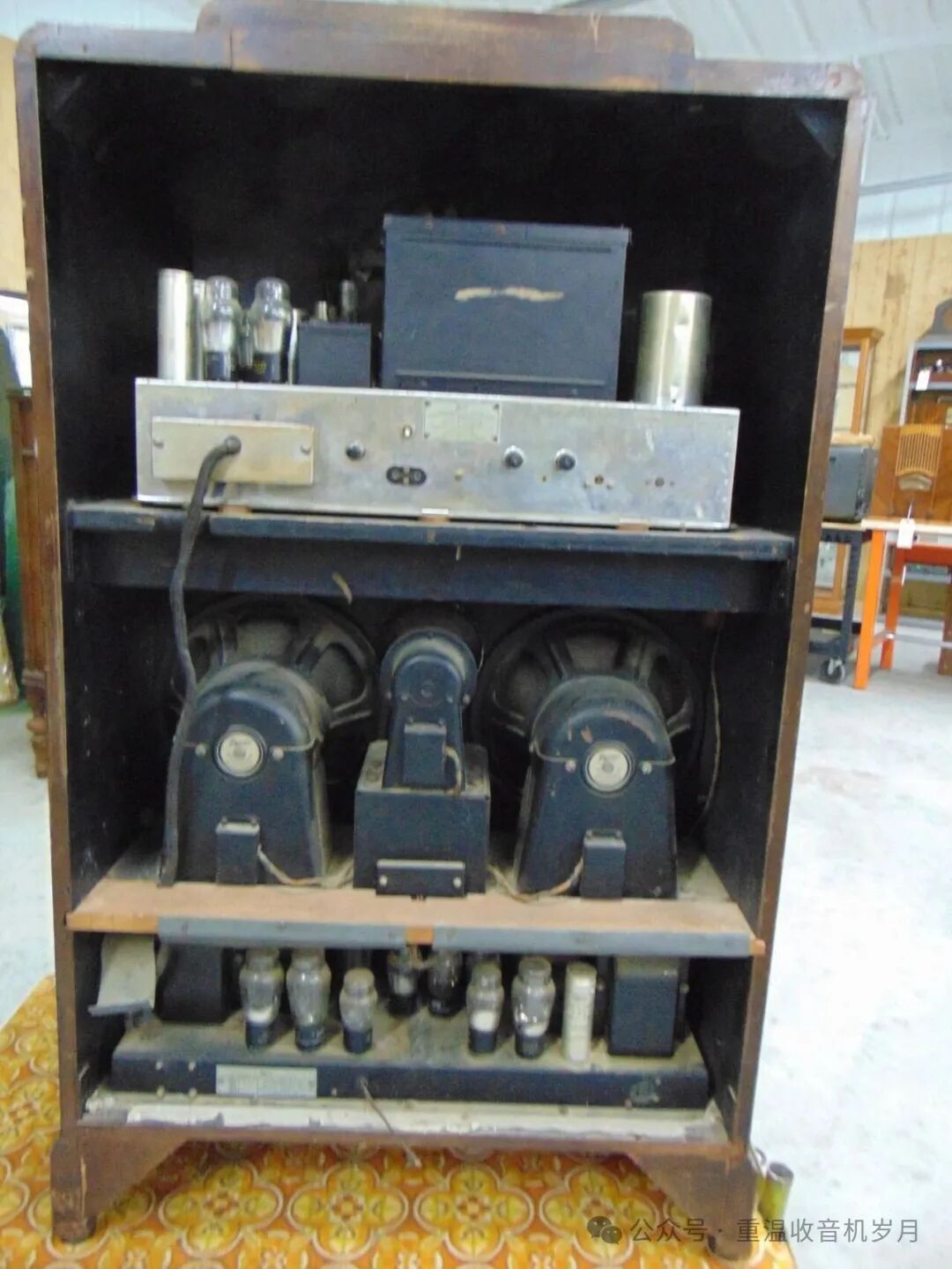两台大型音乐会扬声器负责低频响应的大功率输出,一只小型高频动圈扬声器负责 3000 赫兹以上的高频部分。大型扬声器安装在障板后方,小型扬声器则带有号筒结构,能让声音更均匀地分布在整个房间中。
