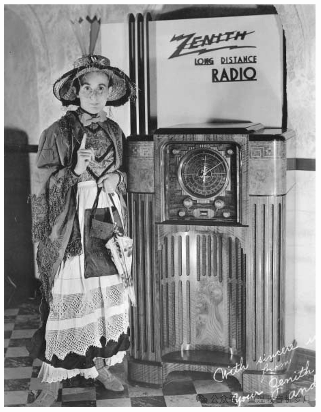 1936 年宾夕法尼亚州中南部Zenith经销商发布的宣传照,Harrisburg地区广播艺人Lizzie Hoy与Stratosphere合影。