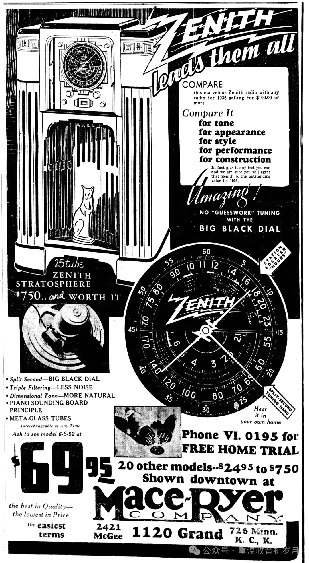 25管Zenith Stratosphere广告,来自《The Kansas City Star》1935年11月21日第4版。