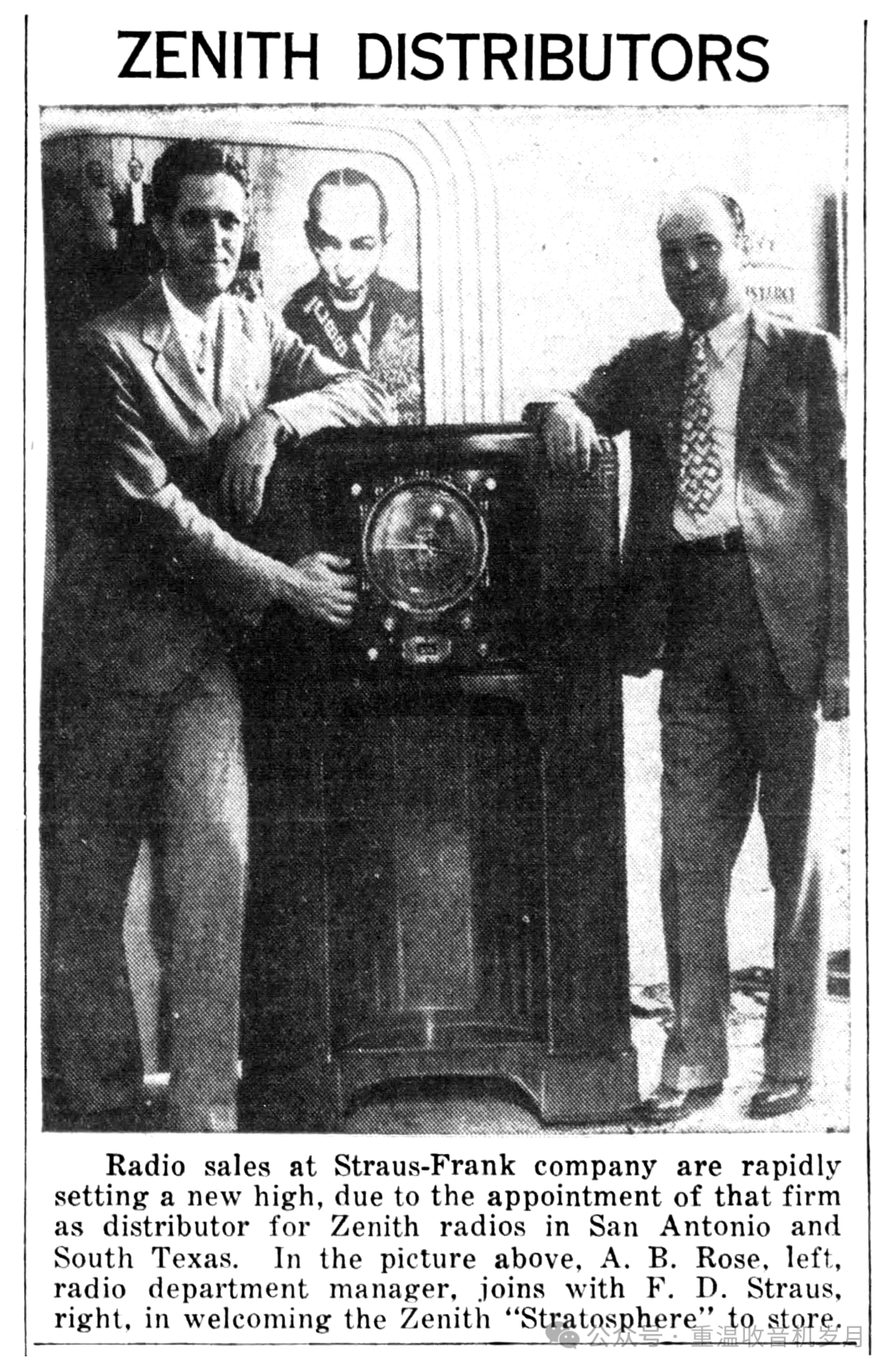 Straus-Frank 公司的收音机销量正飞速创下新高,这得益于该公司获任为 Zenith 收音机在 San Antonio 与 South Texas 地区的授权经销商。上图中,左侧是该公司收音机部门经理 A. B. Rose,右侧是 F. D. Straus,二人一同迎接 Zenith "Stratosphere" 机型入驻门店。