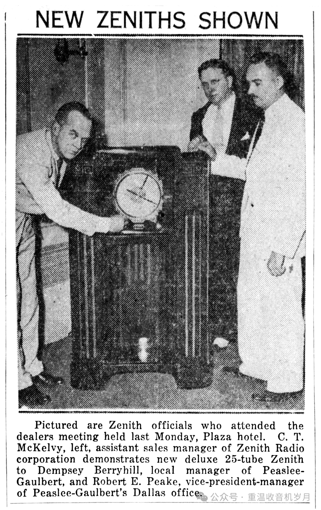 照片中是出席上周一在Plaza酒店举办的经销商会议的Zenith公司代表。左侧的C. T. McKelvy(Zenith无线电公司销售经理助理)正在向Peaslee-Gaulbert公司的本地经理Dempsey Berryhill以及该公司达拉斯办事处的副总裁兼经理Robert E. Peake演示Zenith新款豪华版 25 真空管收音机。