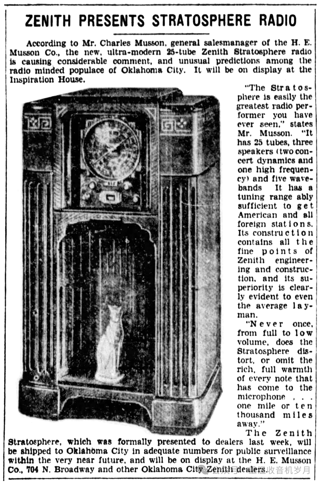 据 H. E. Musson 公司的销售经理 Charles Musson 介绍,这款全新超现代的 25 真空管 Zenith Stratosphere 收音机,正在俄克拉荷马城的无线电爱好者中引发热烈讨论与高度期待,它将在 Inspiration House 展出。