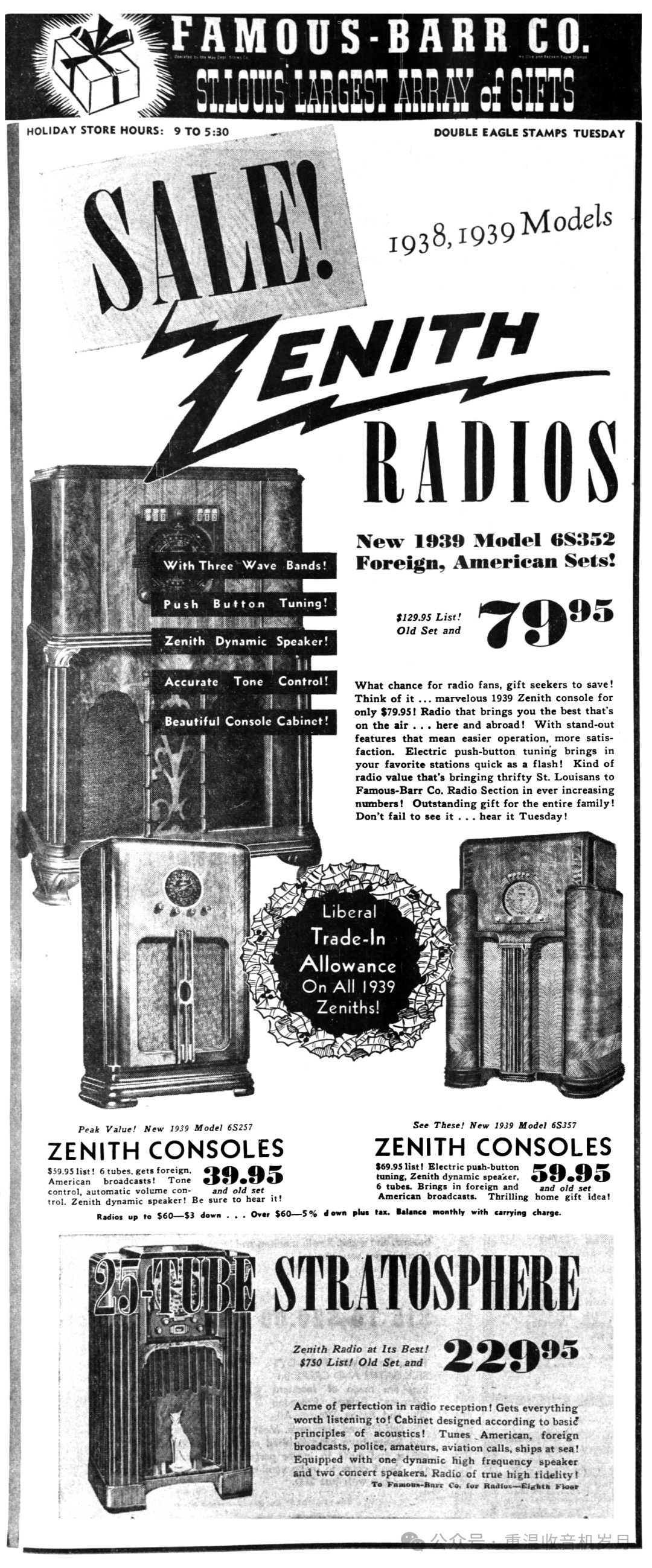 25管Zenith Stratosphere的晚期广告,来自《St Louis Post Dispatch》1938年12月12日第11版。