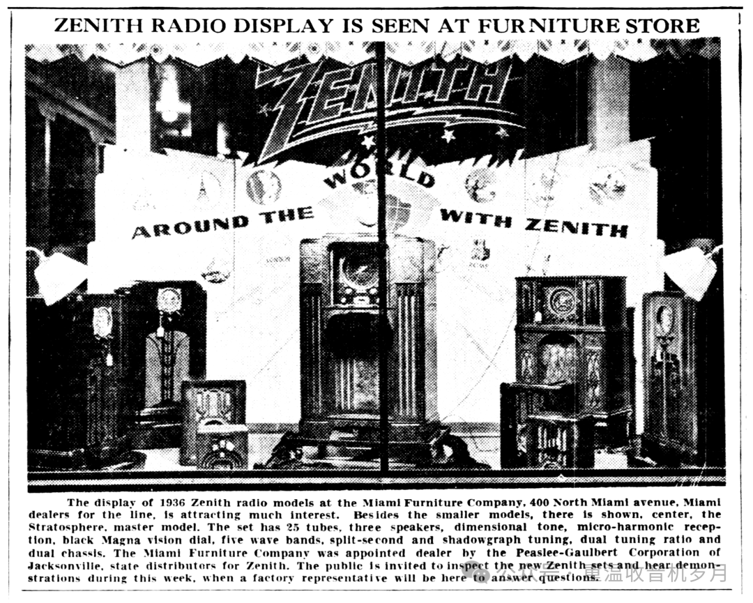 位于迈阿密市北迈阿密大道 400 号、获该系列产品经销权的Miami家具公司,展出了 1936 款 Zenith 全系列收音机,吸引了大量关注。除小型机型外,展区中央展出的是旗舰型号Stratosphere。该机型搭载 25 个真空管、3 组扬声器,具备空间感音色、微谐波接收能力,配备黑色大视野刻度盘、5 个波段,支持瞬时调谐与阴影调谐,采用双调谐比设计与双底盘结构。Miami家具公司由 Zenith 在佛罗里达州的总代理 —— 杰克逊维尔市的Peaslee-Gaulbert公司授权为官方经销商。