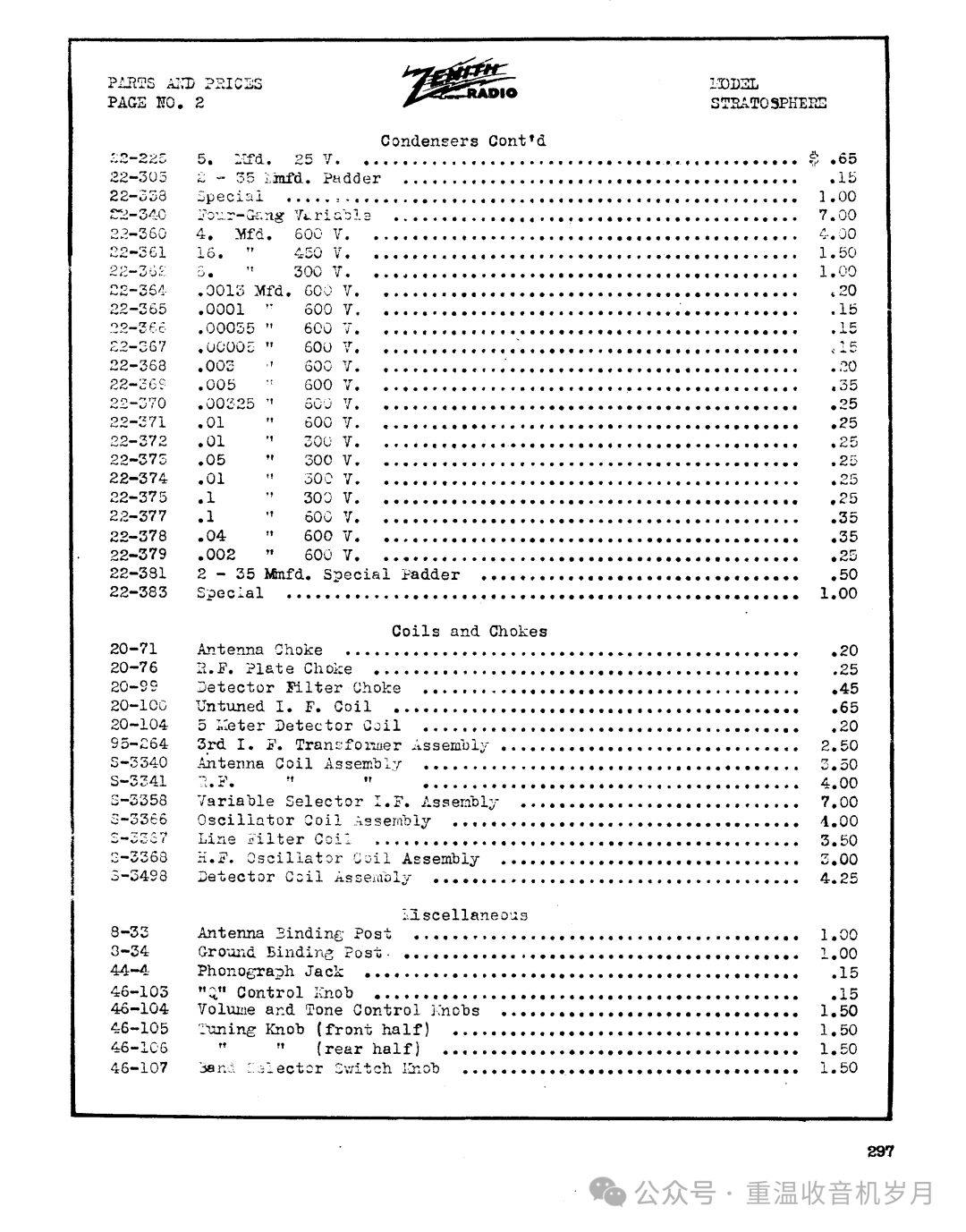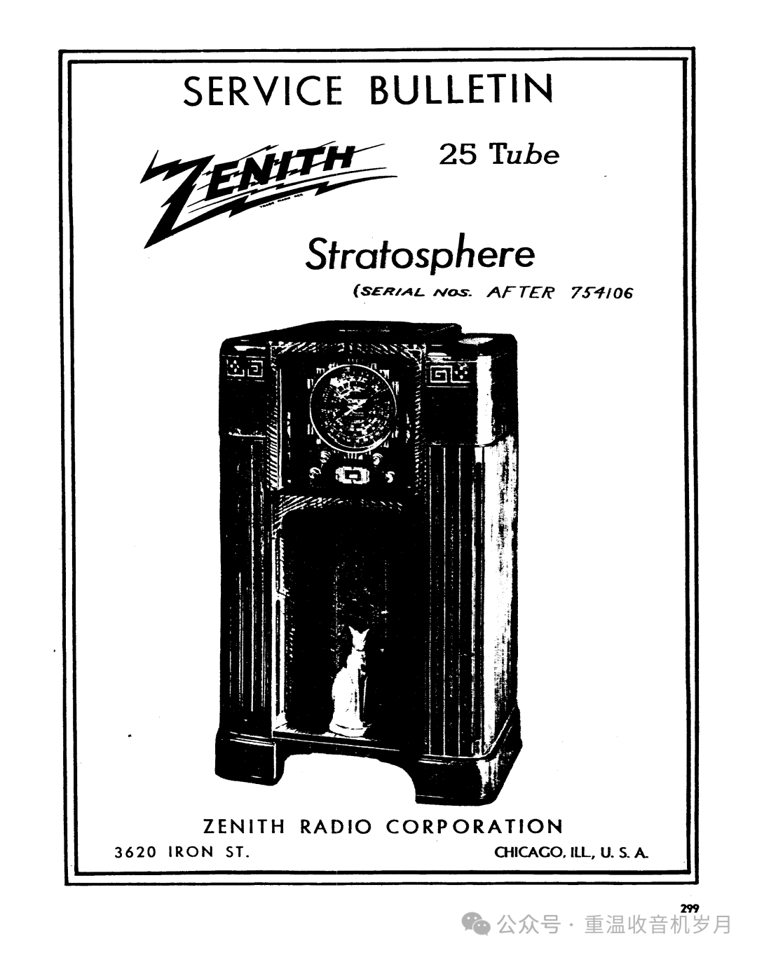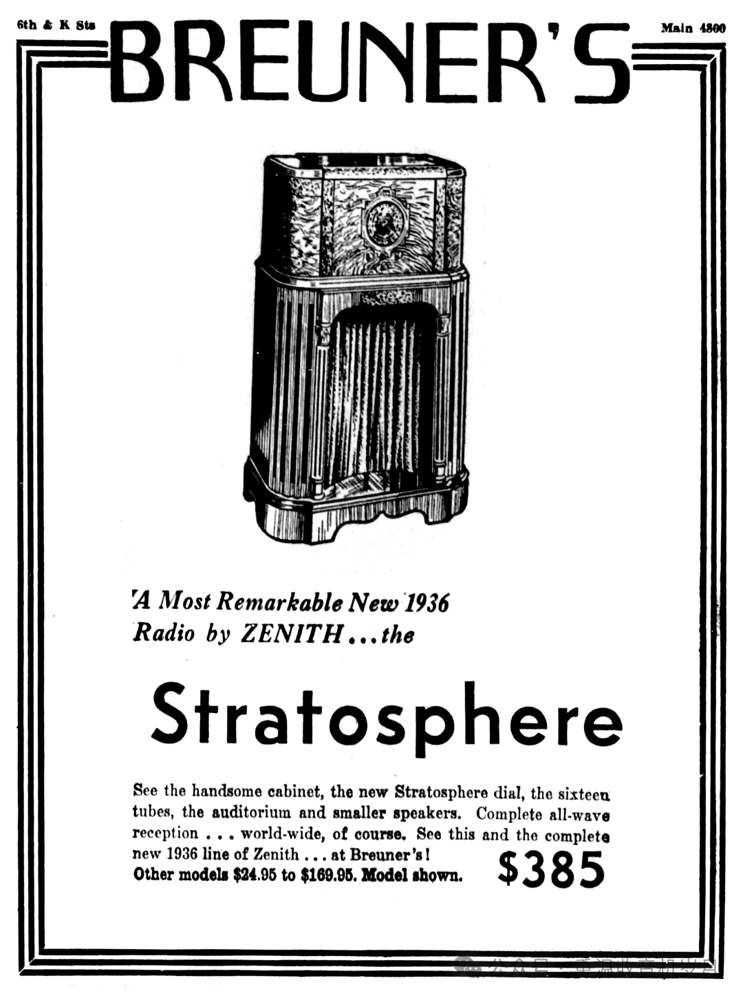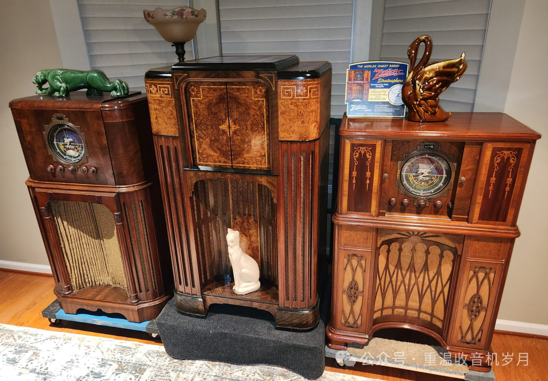ZENITH STRATOSPHERE 16-A-61 型 —— 16 真空管。可接收美国及海外电台;警用、业余无线电、航空通话、海上船舶电台;同时可接收长波波段美国政府气象报告。1 只礼堂级动圈扬声器,1 只 6 英寸高频重放单元(空间感音色技术)。高保真音质。瞬时重调定位器与影示调谐技术。泛音放大器。双底盘结构。机身高度 47 英寸。售价:295.00 美元。