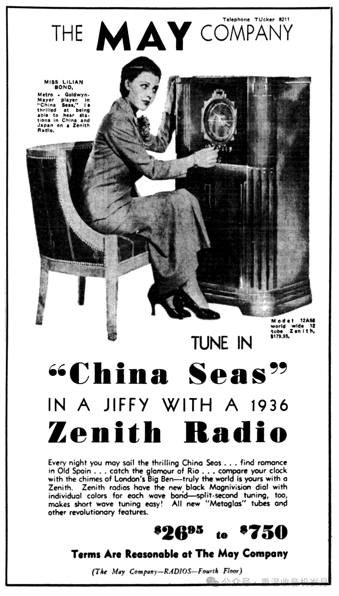 Zenith 12-A-58广告,曾出演影片《中国海》(China Seas)的米高梅影业演员Lilian Bond小姐惊喜地表示,用一台 Zenith 收音机,就能清晰收听到来自中国和日本的电台。来自《The Los Angeles Times》1935年9月1日第22版。