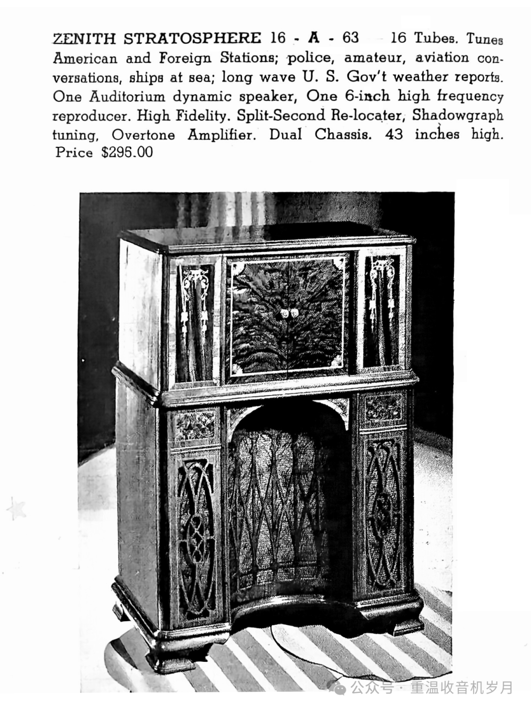 ZENITH STRATOSPHERE 16-A-63 型 16 真空管。可接收美国及海外电台;警用、业余无线电、航空通话、海上船舶电台;长波波段美国政府气象报告。1 只礼堂级动圈扬声器,1 只 6 英寸高频重放单元。高保真音质。瞬时重调定位器、影示调谐、泛音放大器。双底盘结构。机身高度 43 英寸。售价:295.00 美元。