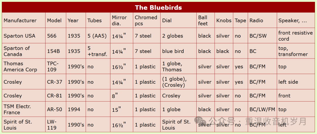 Sparton Bluebird及其复刻版对比表,来自www.radio-antiks.com/IndexRadio-Antiks_Sparton_154B_Bluebird.htm。