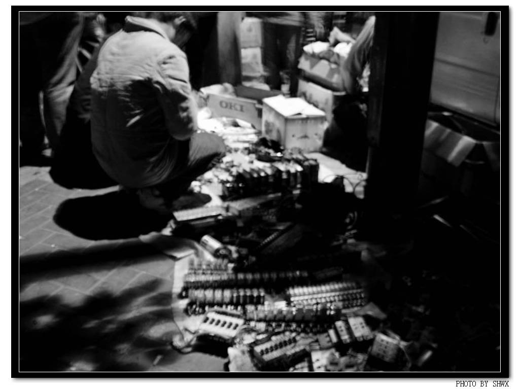 我们感觉这个时刻在校园里不是饭市时间,还是出校去吃,按照哈勃手机短信指引,来到一家快餐店解决,6个人吃着快餐喝着啤酒,也聊到10点了,逛着省城繁荣的街道,在天河坐地铁到荔湾附近,一行6人下榻距离天光墟仅仅100米的某某旅社,结果这是个错误的选择,看来这个旅社接待去天光墟的人多了,留了心眼,住的是2个人,其他的要在12点离开房间。我们稍事在房间休息半小时,他们就敲门了,早知道就上酒店开房了,各位来省城淘垃圾的要切记这个教训呀!当然是出差的madog留在房间,我们四人帮(shwx、网事随风、meng、feyue)此刻就出没在不夜城的街道上游逛了,吃了一家店,这里凌晨1点打烊,再寻找另外一家店,不错,骑楼下的,网事随风与feyue打打小盹,我与meng在酒精和胆固醇的伴随下,聊起了物业管理等等话题…..时间临近3点,我们移步到荔湾电子市场,已经有不少人聚集了,有人已经在市场外就把摊子摆开了,都是一些开关、接插组件,不是特别的东西。