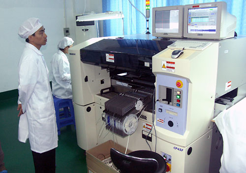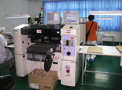 生产机器的第一道工序,将从元件贴片焊接开始。不过在焊接贴片前,要对电路板上膏。富含金属锡份而带有粘性的锡膏通过引模均匀地涂在电路板的每一个焊点上,以方便粘住电子元件。