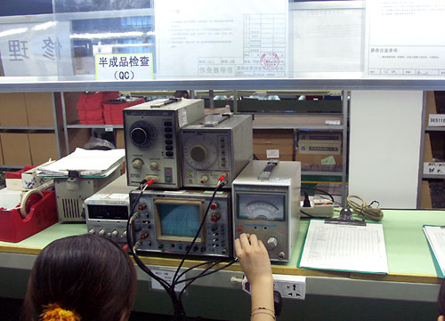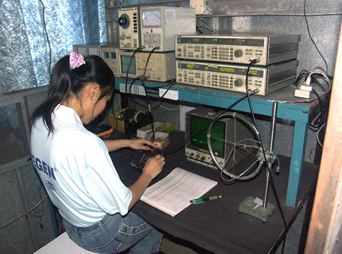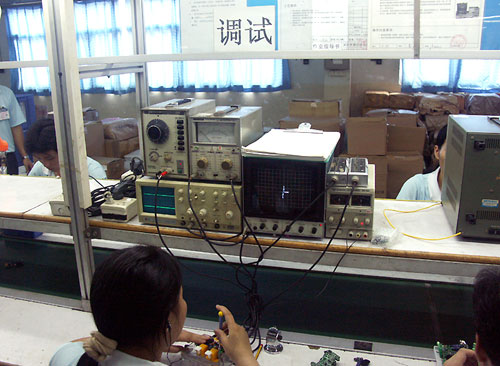 在组装过程中,工作人员正在检测调教MP3随身听的输出波形。
