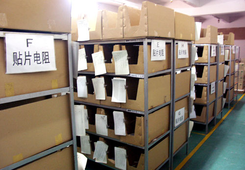车间的一侧货架上有条不紊的摆放了各种不同的各种不同的电子元件以及各种原材料配件。这些制作MP3最基本的材料。来料检测组已对最初零部件元件进行详细的检测、测试,跟后面的生产过程提供最基础的质量保证。