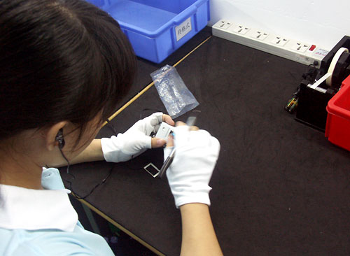 包装组将说明书、光盘、电池、耳塞等配件和机器一起包装进盒子里,也就终于完成了所有的工序。