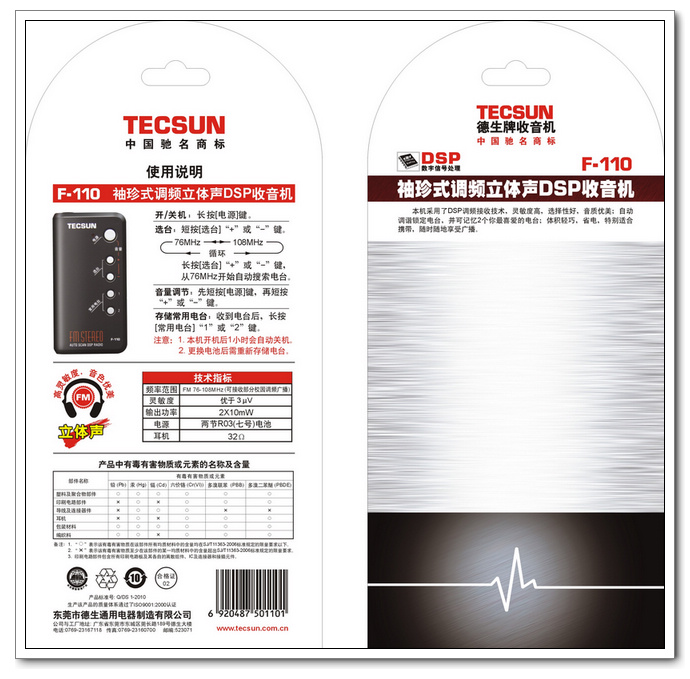 赠品:凡直接向东莞德生公司邮购、通过德生淘宝店网购以及上门直接购买F-110,每台均附送2节7#普通电池,即买即用。