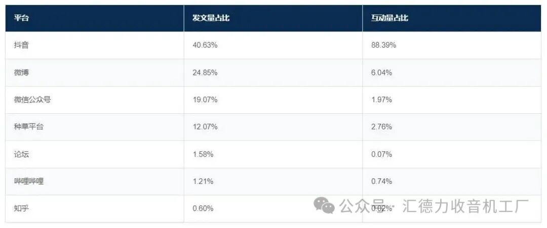 国内收音机产品的销售渠道正日益多元化,线上平台已成为消费者触达和购买的核心场域。抖音电商以内容驱动成为销售高地,贡献了全网高达 88.39% 的互动量,并直接转化为显著的销售业绩。 电商平台(京东、天猫) 是传统信任基石,承载着消费者对品牌和品质的期待。而种草平台则是口碑传播和激发购买欲望的关键阵地,贡献了 12.07% 的发文量。消费者呈现出多触点、场景化的决策偏好,通常在社交媒体种草,在传统电商比价研究,最终在最便捷或信任的渠道完成购买。
