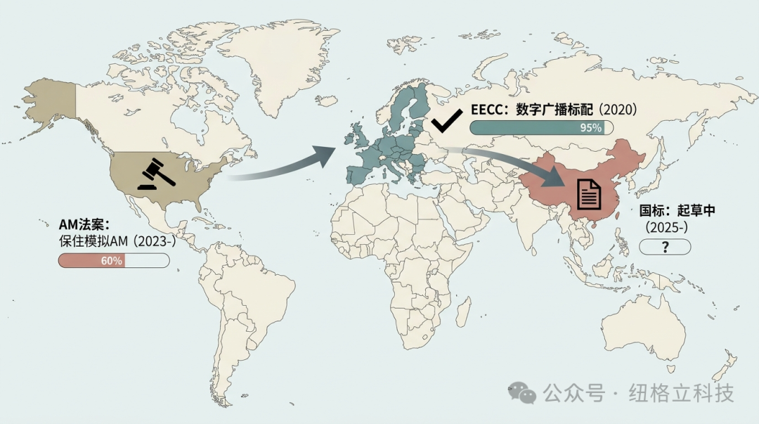 但请注意这个法案的名称:AM Radio——模拟AM。不是数字广播。美国国会正在动员巨大的政治资源,只是为了保住一项上世纪20年代的技术。这恰恰是系列前文《美国HD Radio的前车之鉴》中讨论过的困局:因为20年来数字广播一直是"可选",美国至今没有建立起数字广播的车载生态,以至于在危机到来时,只能退守到最原始的模拟AM。