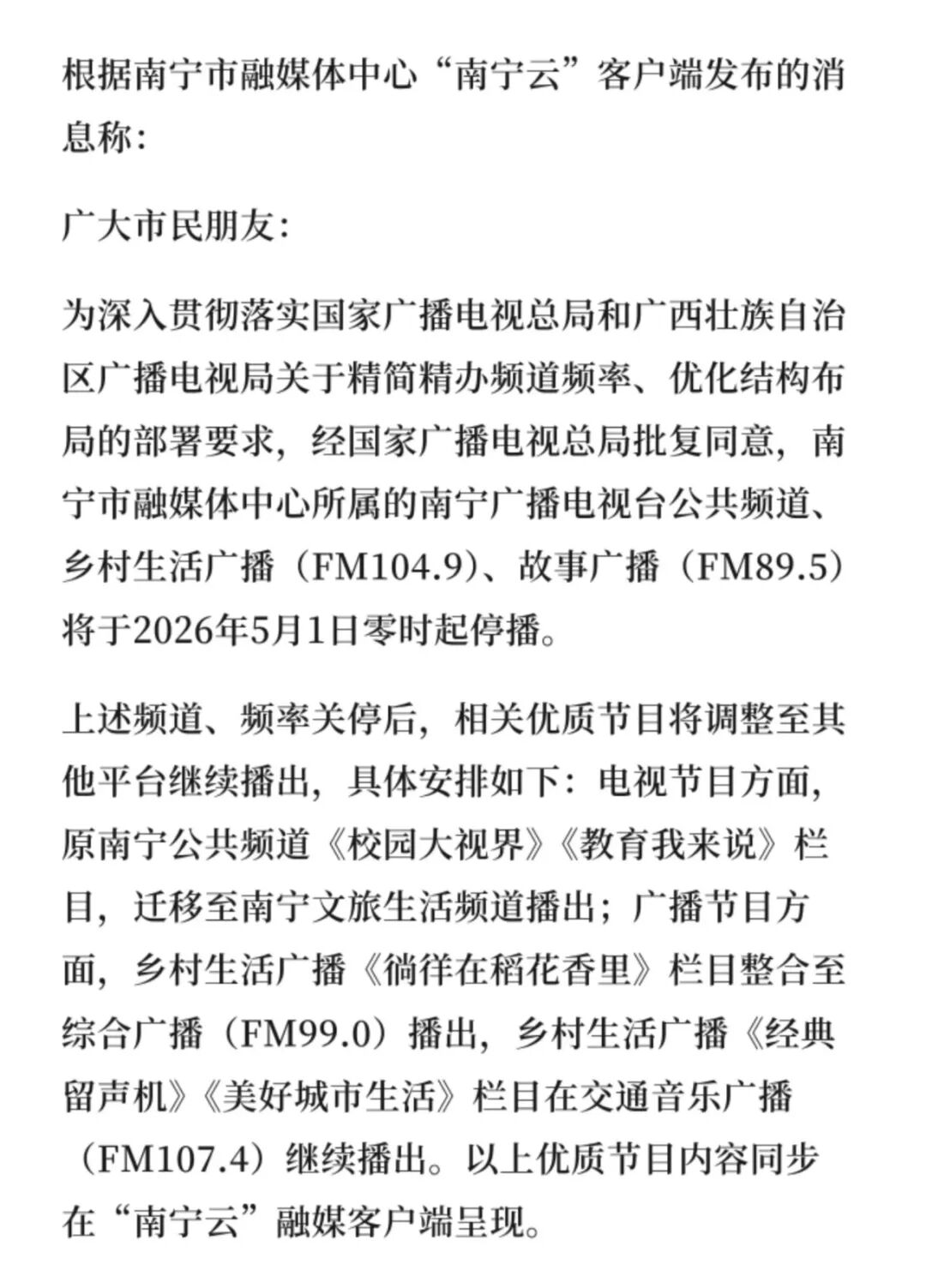 2025年12月成为多地同步调整的集中期,2026年三、四月间步入收尾落地阶段,时至如今,南宁市的两个调频广播也终于明确了停播安排,这场覆盖广泛的频率精简,也渐渐落下了帷幕。