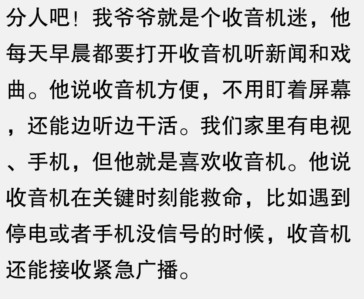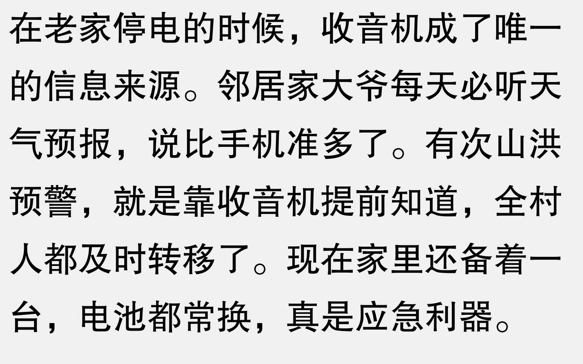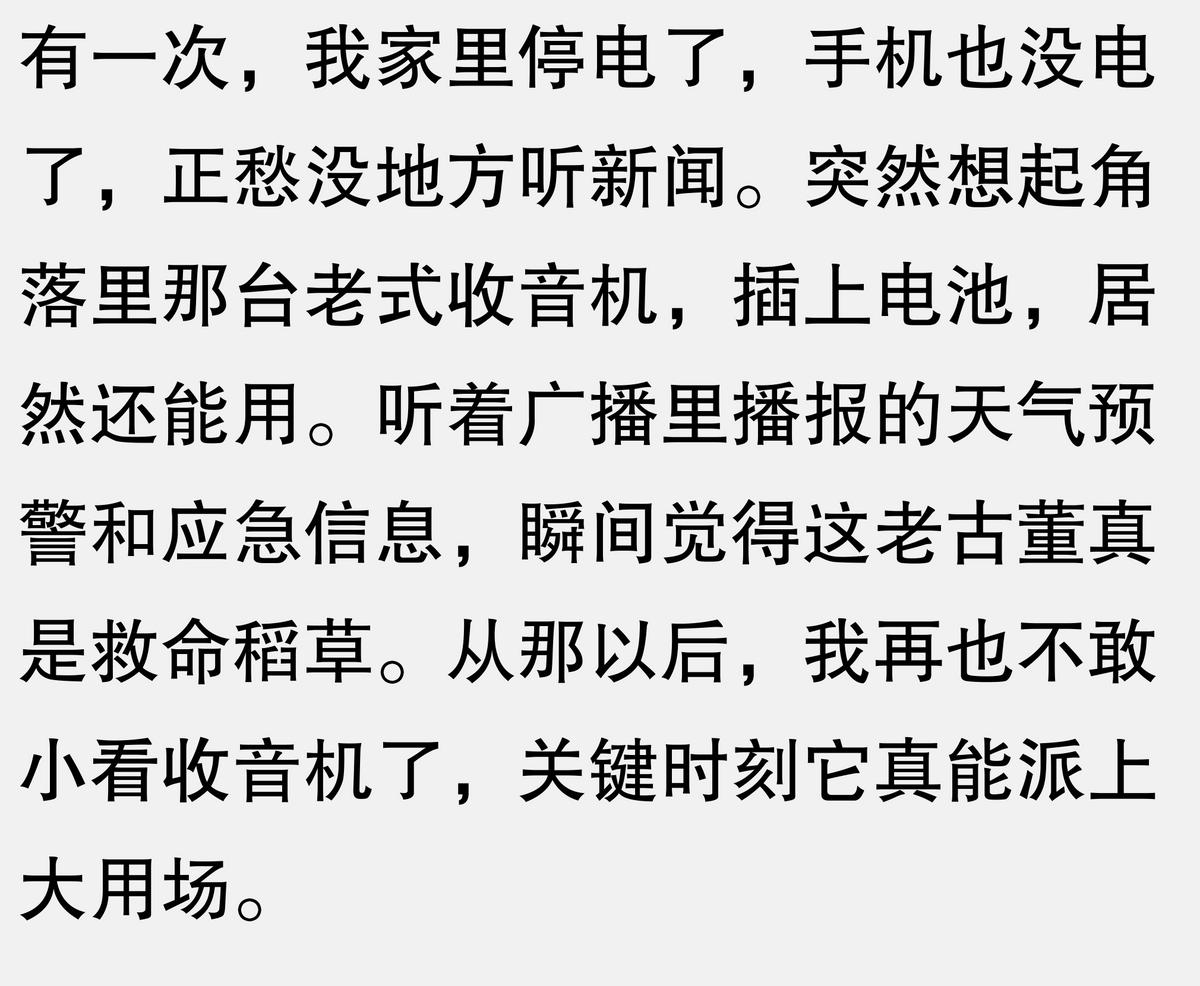 上次我们这儿停电了,手机没信号,电脑也用不了,全靠一台老式收音机听天气预报和新闻。邻居家老奶奶天天抱着收音机听戏曲,说比电视还亲切。这东西看着不起眼,真到紧急时刻还真离不了它。
