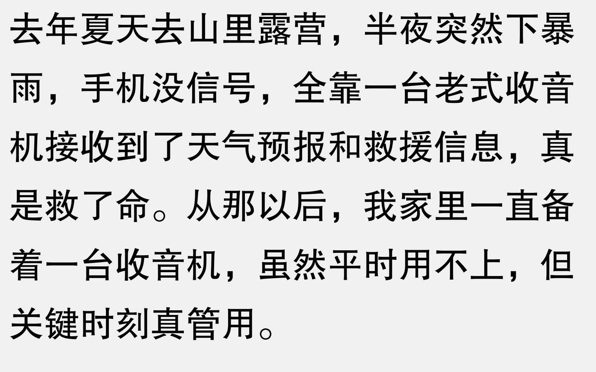 去年夏天去山里露营,晚上突然下暴雨,手机没信号,全靠一台老式收音机听天气预报,才知道山洪要来了,赶紧带着朋友撤离。现在想想,那台收音机真救了我们的命。