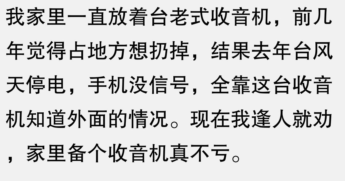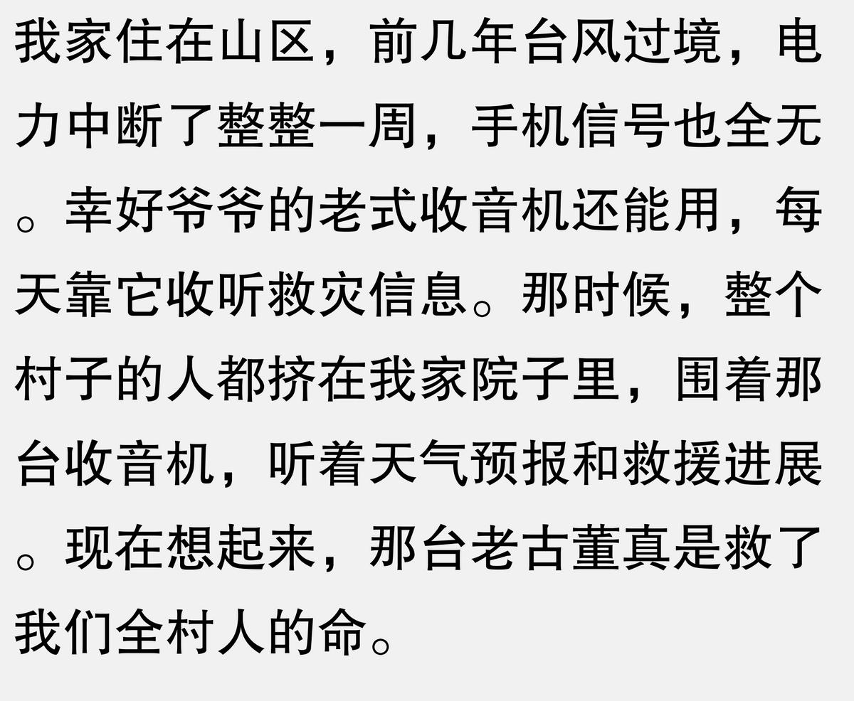 我爷爷家有一台老式收音机,用了三十多年了,去年台风天停电,手机没信号,全靠这台收音机接收到了救灾信息。平时放在角落里积灰,关键时刻真的能救命。现在年轻人可能觉得收音机过时了,但在偏远山区和特殊情况下,它依然是重要的通讯工具。