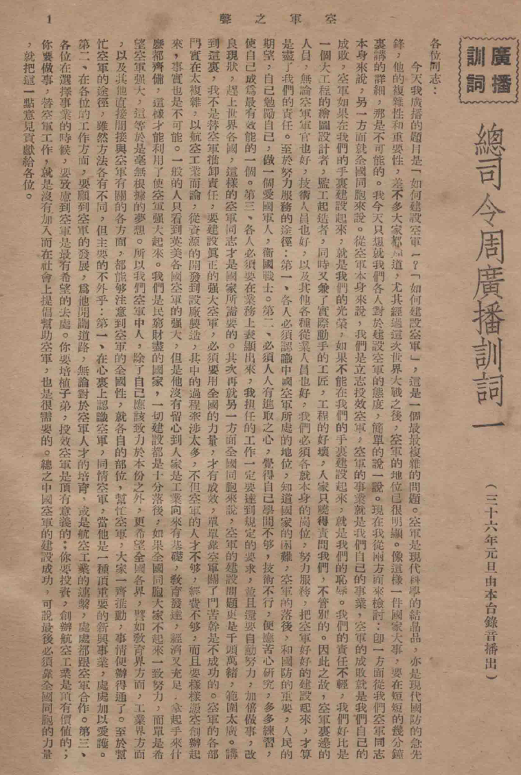 (空军周总司令于电台开播当天的录音讲话-《如何建设空军》)