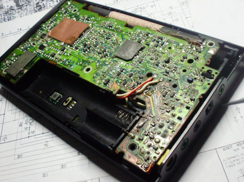 打理一台上家岛鼓过的SONY ICF-SW7600G 收音机,据鸡主描述,鸡鸡首先是被电池电解液严重腐蚀,罢工了,送去当地的一个维修师傅搭理过,结果到鸡主手上显示已经开机了,可就是不干活,也不会说话,耳朵孔也没任何反应,没办法鸡主找到了我,说让我给诊断诊断,没过几天鸡鸡安全送到我手上,