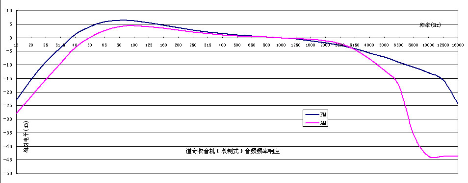 信号输入46dBuV(标准《调频广播接收机测量方法》规定为60dBuV,为强信号,实测其实现代FM接收机超过30dBuV都已进入稳定状态,所以取46dBuV更适合中强信号),音量都在1/3出左右。以1kHz音频输出做0dB,纵坐标为其他音频输出电平相对于1KHz的相对电平(dB),至于这个先锋OEM的霸道短波机,有人说音质极差,有的说他的低音欲罢不能,谜底在此:(所有机器的高低音调节钮都设为0)