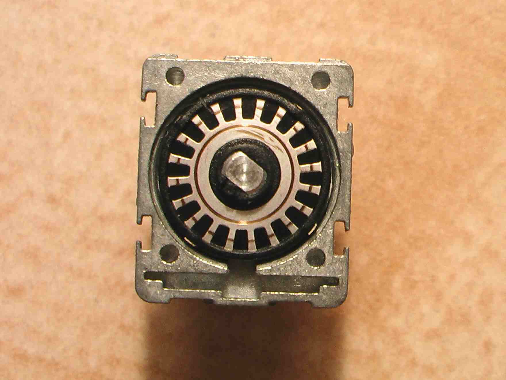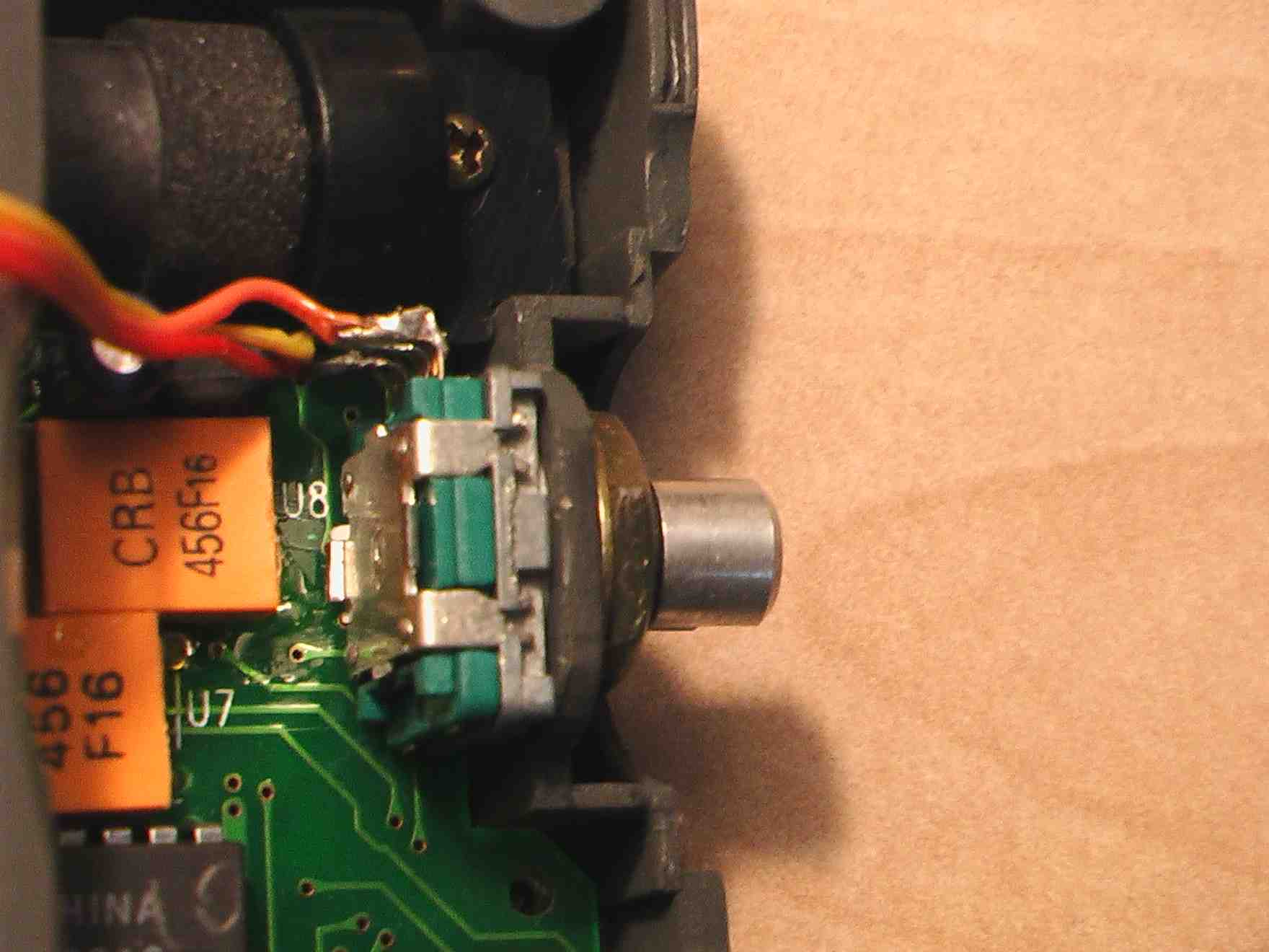 二、打开后盖,露出飞梭的安装位置。记住:引线一侧是向上的。