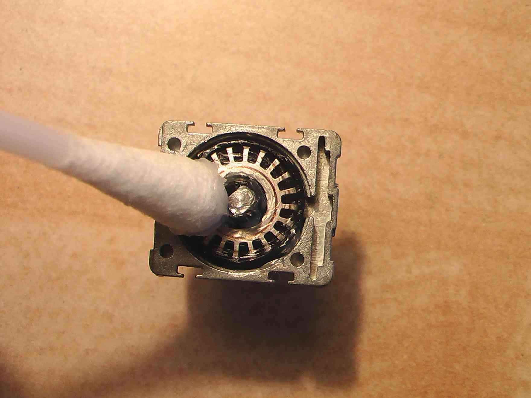八、用棉签沾少量酒精,擦洗飞梭。晾干后,用少量润滑脂再涂抹在上面。