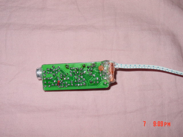 戴上6节五号电池工作了,电池连接线就是发射天线:经初步把玩后确认有效作用距离至少有200米(不拉收音机的天线)以上,呵呵