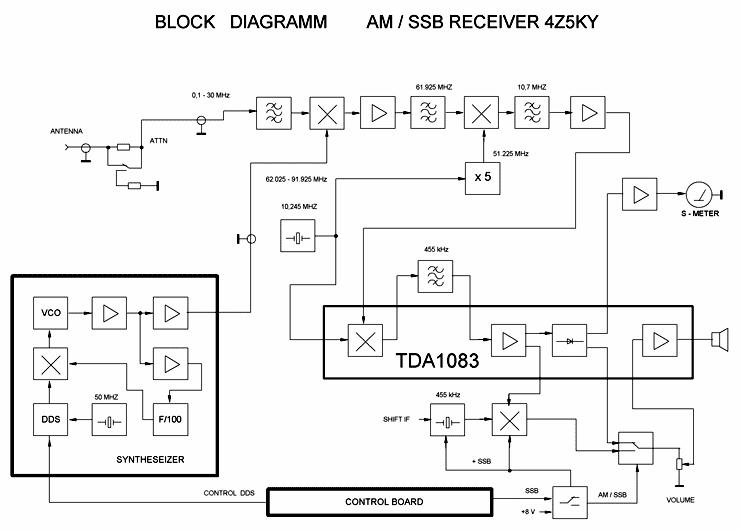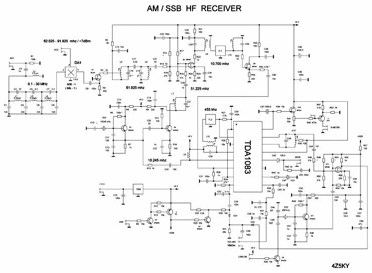 滤波后的信号从三极管Q6第二脚进入第二混频器,第二脚进入的本振信号51.225 MHz (倍增器x5),从三极管Q4返回。L9C28回路解出的10.7 MHz第二中频信号进入第二中频滤波器,抑制第三中频455 kHz ( 10.245 – 0.455 = 9.79 MHz )的镜像频道。经过滤波,第二中频信号进入转发器Q8,然后进入集成电路DA2 TDA1083输入端(完全等同К174ХА10),经放大并进入集成电路内部混频器,本振信号10.245 MHz (Q2)也由此通过。455 kHz第三中频信号从集成电路第四输出经压电陶瓷滤波器进入TDA1083中频线路,并在这里完成放大、鉴频 。除此之外,信号从中频输出进入混频检波器(三级管Q13的第二脚),从第二脚(SSB方式下)进入本振信号455 kHz (Q11)。音频信号从场效应晶体管进入АМ/SSB (VD1VD2)方式下电子整流器和音量调节器,ЗЧ信号在TDA1083内部衰减。经过С42由扬声器或耳机放大、输出。