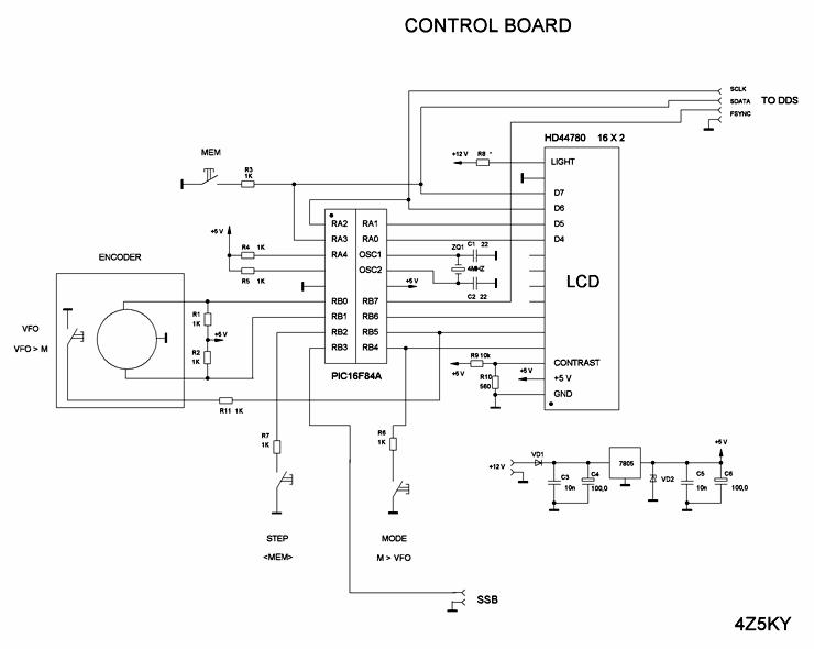 控制模块使用最常见的PIC16F84A和两行LCD HD44780。电路很简单也不需过多的解释。