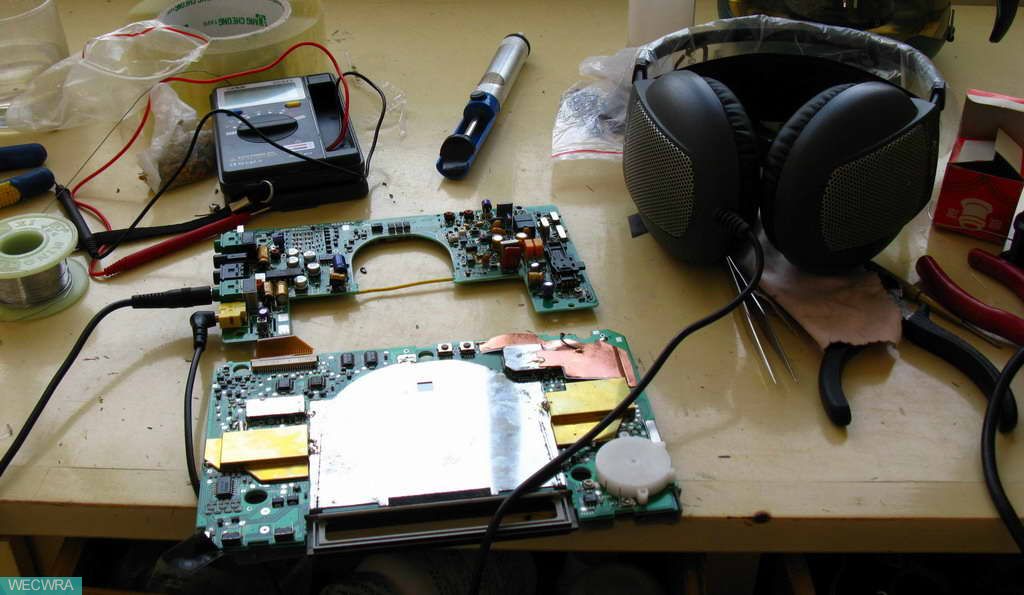 电路板上都是漏液腐蚀的痕迹,我用了好多的酒精清洗,总算弄完了,由于都是贴片的东西,我没有,所以只能是用普通的替代,但是我觉得我的东西更是好呢,下面试机,呵呵,调频的问题基本解决,但是轻音的问题和没有立体声的问题还是存在.当时我就犯了个错误,本来应该首先检查功放的,但是我只是简单的短路下功放的输入端,以为这样声音一样了功放电路就没有毛病,再说拿5个电解看上去还是很好的,所以就没有多考虑,就疯狂的在前己找毛病,3335解码电路仔细检查,用别的机器的立体声信号引过来输入看,还是没有,就检查,就那么几个器件,没有毛病啊,于是再按照电路图向前找,最后找到CXD20111的21输出脚,还是没有结果,又返回来找,这是我灵机移动,还是试下线路输出吧,试验下还是轻音,看来前极问题还是有的,我又仔细检查,最后发现一个0.1微法的贴片实效了,有点短路的迹象,换了之后立体声出来了,哎,废了好大的力气,用功放听还是轻音,奶奶的,看来可能是音调或者是电位器的问题,又查,这会怎么查液没有毛病了,没有办法,最后回来看功放,电冶液很正常啊,算了,把哪几个100微法的换掉看看吧,呵呵,这会换好机器好使了,妈的废了我将近一天的时间找,哎,看来老前辈的经验还是很准的,