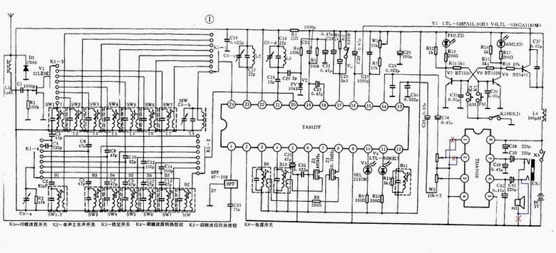 伯龙HS902是一款非常优秀的袖珍收音机,特别是当用耳机听调频立体声时,立体声分离度高,音质也是非常好,声音很通透.这跟这款收音机音频功放采用菲利蒲TDA7050是分不开的,但是这款收音机用喇叭放音时,音量较小,分析电路图,原来喇叭是接在TDA7050的一个声道输出端上,而TDA7050的作双声道输出时,功率才30MW左右,这样就造成当用喇叭时输出功率严重不足.经试验,我将此机的功放在用喇叭放音时采用BTL接法,这样就是输出功率得到了很大的提高,可达100MW以上,解决了输出功率小的问题,大大提高了喇叭放音时的音量,而在用耳机听时,还是立体声.改制时按图在红叉处断开原来的连接,然后按兰色标记线重新焊接连接即可.当然如果能将喇叭换成16欧的更好,可以减少失真