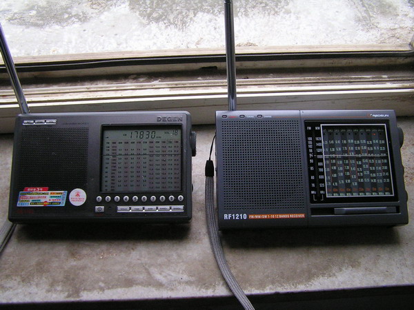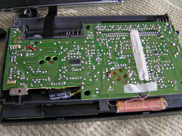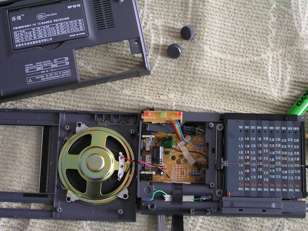 今天闲来无事,看着我那刻度不准的RF1210收音机就来气,所以动一下手术,将刻度位置调整一下,原来频率在短波电台位置要差近50千赫,主要在频率高端相差很多,因为指针有些斜,所以把它端正过来,先动手打开后盖上5个螺丝,一长四短,打开,可以看见里面电路板,工艺感觉还可以,后背板上有一个防静电及防干扰的铝箔,只能看到一个小集成电路,型号看不清楚,在卸下固定电路板的6个螺丝,翻过来就可以看到刻度盘了,这个机器用的喇叭是防磁的,感觉质量还不错,可惜没有标明功率大小,由于主要任务是调整指针,所以就不继续拆了,用手将指针掰正位置,然后将机身还原,调节接收17845千赫的NHK台,999千赫的中国之声,位置基本正确,胜利完工。