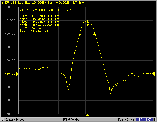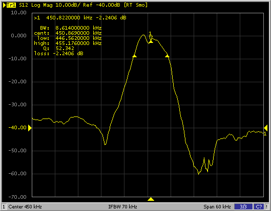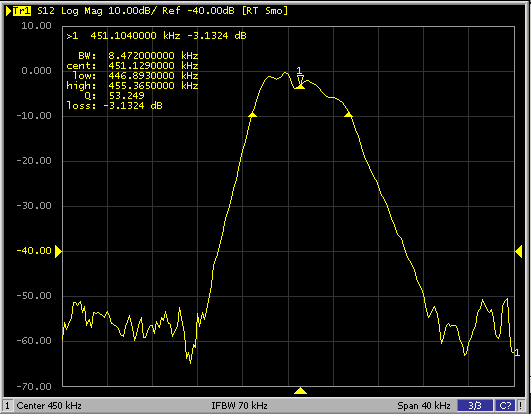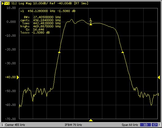 乖乖!好方正啊!第一次看到矩形系数这么好的虑波器。当然带宽不算窄,-6dB是23kHz。不过回头想想用在什么地方就明白了----VHF电台里面的。呵呵,同学们检到了千万别看到漂亮就换到收音机里面,那样好像不会有什么好处的。