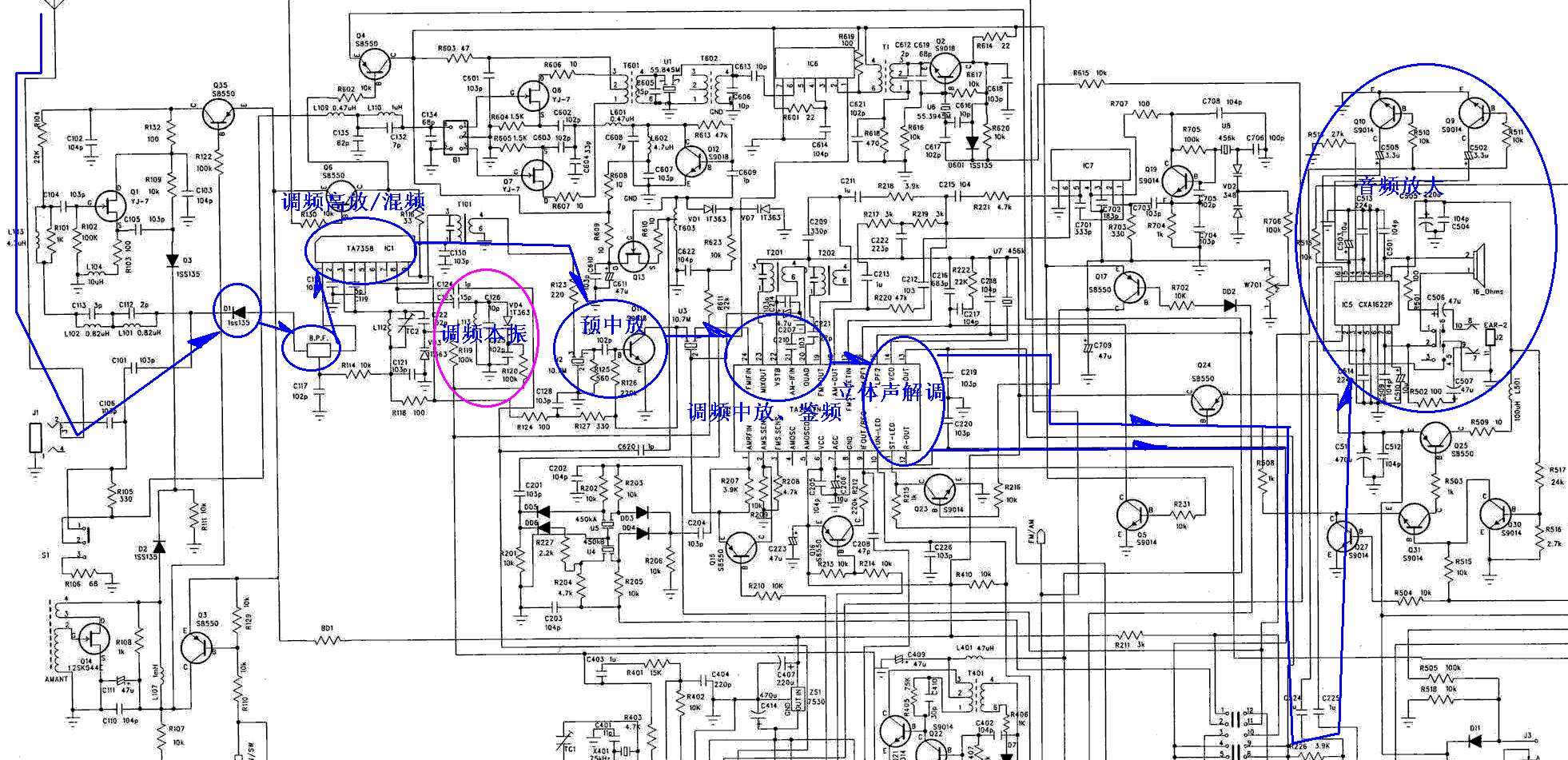 音频通道由IC3、IC5等完成(IC3线路输出缓冲,IC5音频放大),Q9、Q10是音调控制开关管。
