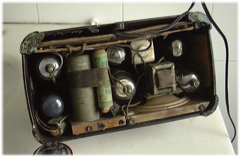 奇怪的是此机前后都是一个整体胶木壳,点水不漏.原来要从底部才能看到机机的芯子,且所有的6个管子都是倒置的.