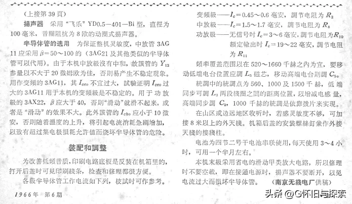 介绍熊猫B-302型半导体收音机 广播发烧网 2024-10-22 16:41 电路及维修 这是《無线电》杂志1966年第6期P37-39上的一篇,介绍由南京无线电厂生产的熊猫B-302型半导体收音机的文章。主要内容有:一、电路工作原理,二、电路特点,三、主要性能指标,五、元件数据,六、装配和调整。 #收音机 #熊猫 文章目录 × 推荐阅读AM/FM收音机的安装与调试德生PL757、R-9701、R-818、R-202T系列收音机原理、维修与实测数据浅析德生BCL3000的电路德生PL-380小打磨熊猫802-1收音机电路分析与维修收音机工作原理矿石收音机制作教程(一)新人试做TEF6686 DSP 收音机德生R-9701收音机电路原理解析给PL380无损加装外接中波天线功能 上一篇 基于TEF6686芯片收音机SR286和DP666的看法 下一篇 谈谈对网购的DP666收音机的初步印象