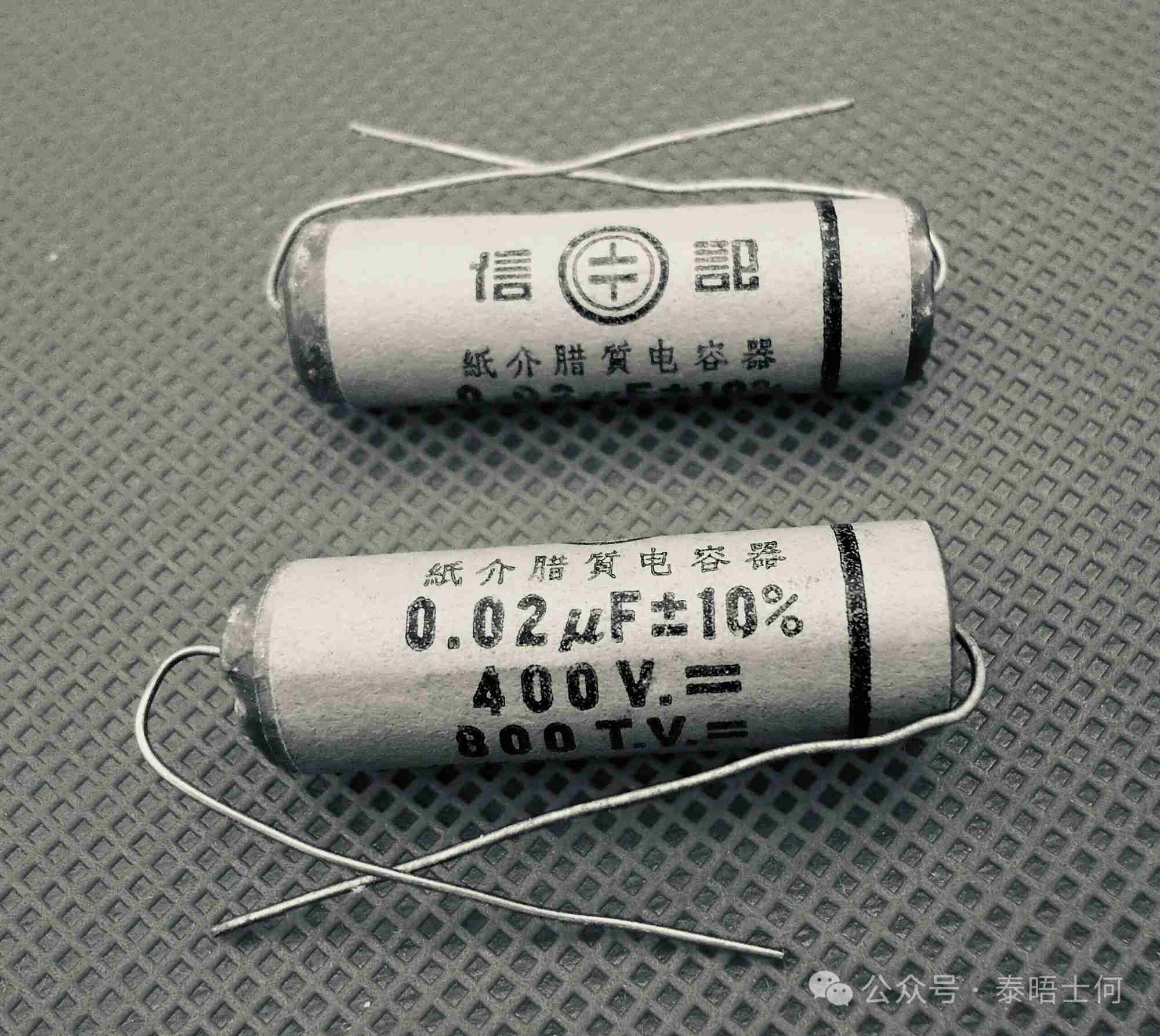 2. 纸质固定电容(蜡纸/油浸纸介):常见0.001–0.47μF,用于耦合、旁路、低频滤波;成本低,早期多为蜡封圆柱,后来有金属壳;缺点是易老化漏电。