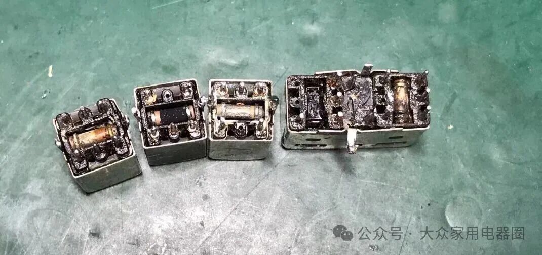 5. 调频灵敏度低。该机调频头使用分立元件,故障很少,灵敏度低应该重点怀疑中频输出变压器,其次是个别瓷片电容。我只遇到一起瓷片电容短路造成灵敏度低的问题,因此重点说说中频变压器也就是中周的问题。该机使用的中周都自带有瓷管谐振电容,这种电容有个通病就是时间久了氧化发黑导致中周失谐,Q值严重降低,使得信号传输效率降低,没有足够的中频信号输入中放从而导致灵敏度低,调谐灯没法点亮和音质不佳的问题。