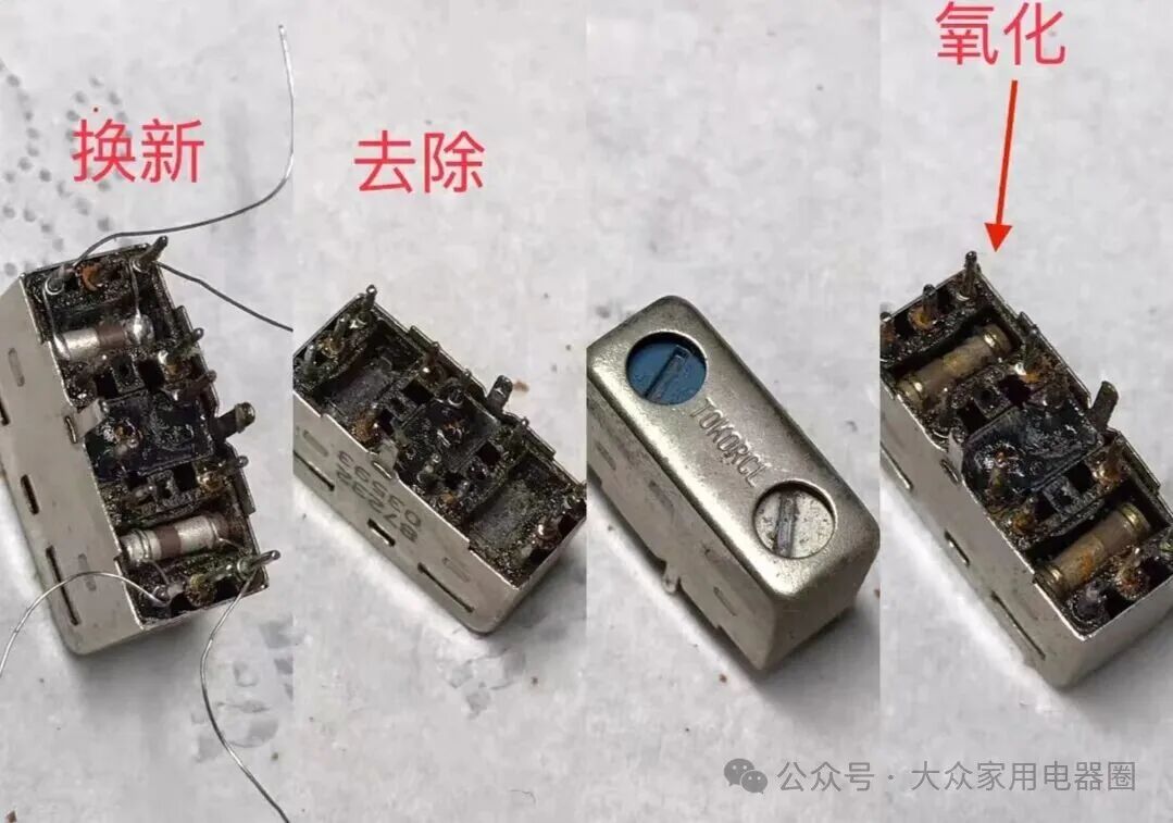 4. 波段开关的氧化清理。该机的波段开关密封的不好,触片很容易氧化发黑造成切换杂音或者接触不良甚至某波段无台。如果氧化不严重,可以注入除锈剂后多次来回拨动开关去除氧化层,如果无效,只有将开关拆下,然后拆开用砂纸去除动片静片的氧化,工作量大。