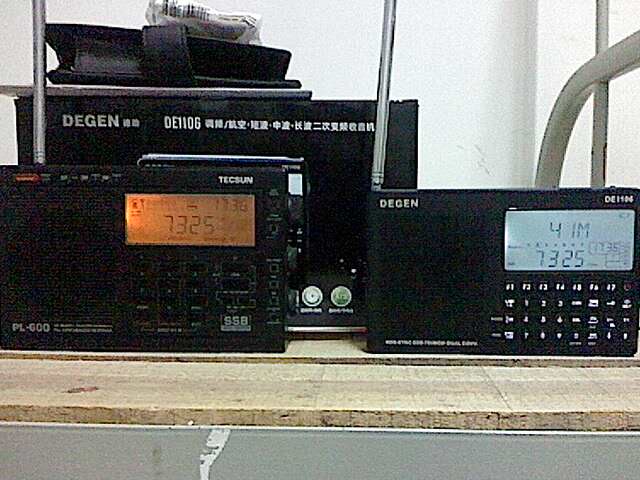 为了确定,我今天下午(四五点钟)对比收听了9540KHZ希望之声,可以肯定是中等以上强度的电台,在PL600低噪声很小,而DE1106却很大。我有些担心了,又搜索了7325KHZ法国国际广播电台,仍然是背景噪音很明显,我不能推测是是不是DE1106比DE1106的结论,我很害怕一台500元的封顶之作会比平民阶级的PL600的灵敏度还要低。于是,一痛搜索,无论是强台还是弱台,DE1106背景噪音都比PL600大。但是不至于恐怖,只是很明显,对于对收音机很苛刻的我们来说,比较明显!也许比安键09要好些,但我没有对比,09已经在柜子立静静地躺了不少日子了,欣赏有余,使用无心。