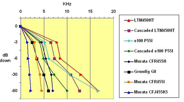 对比中也包括了LTM-455HT(大量销售的好滤波器),既有单级滤波也有两级滤波,以及两种其他的高质量的村田陶瓷滤波器。