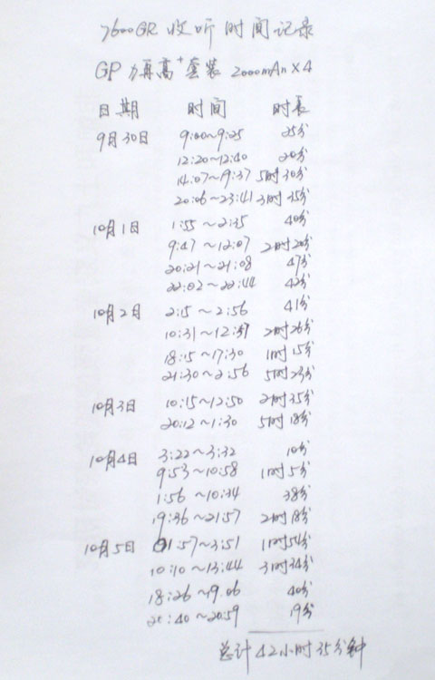 GP 2000mAn满电一次收听时间记录表(接收本地FM信号)